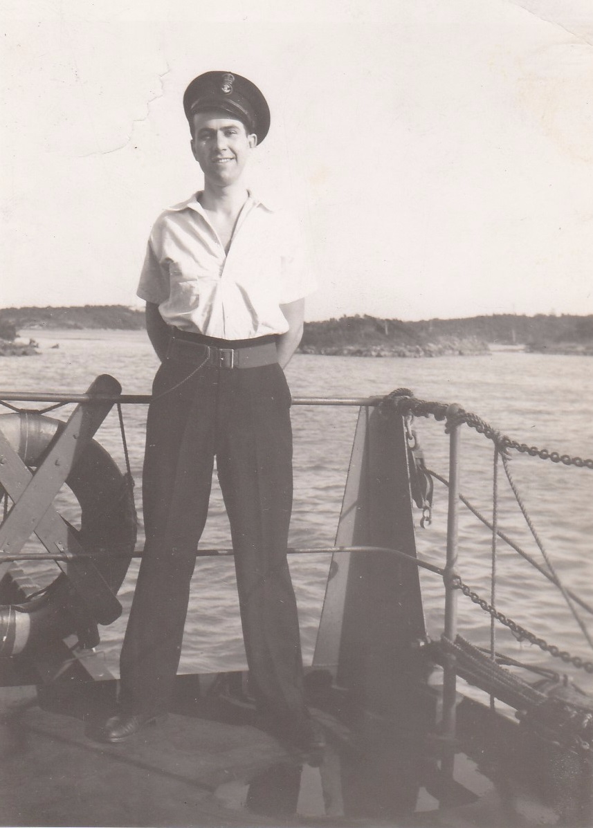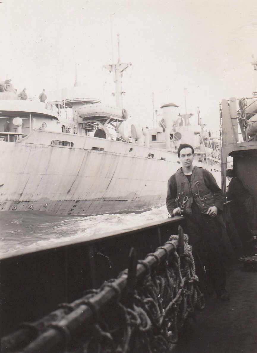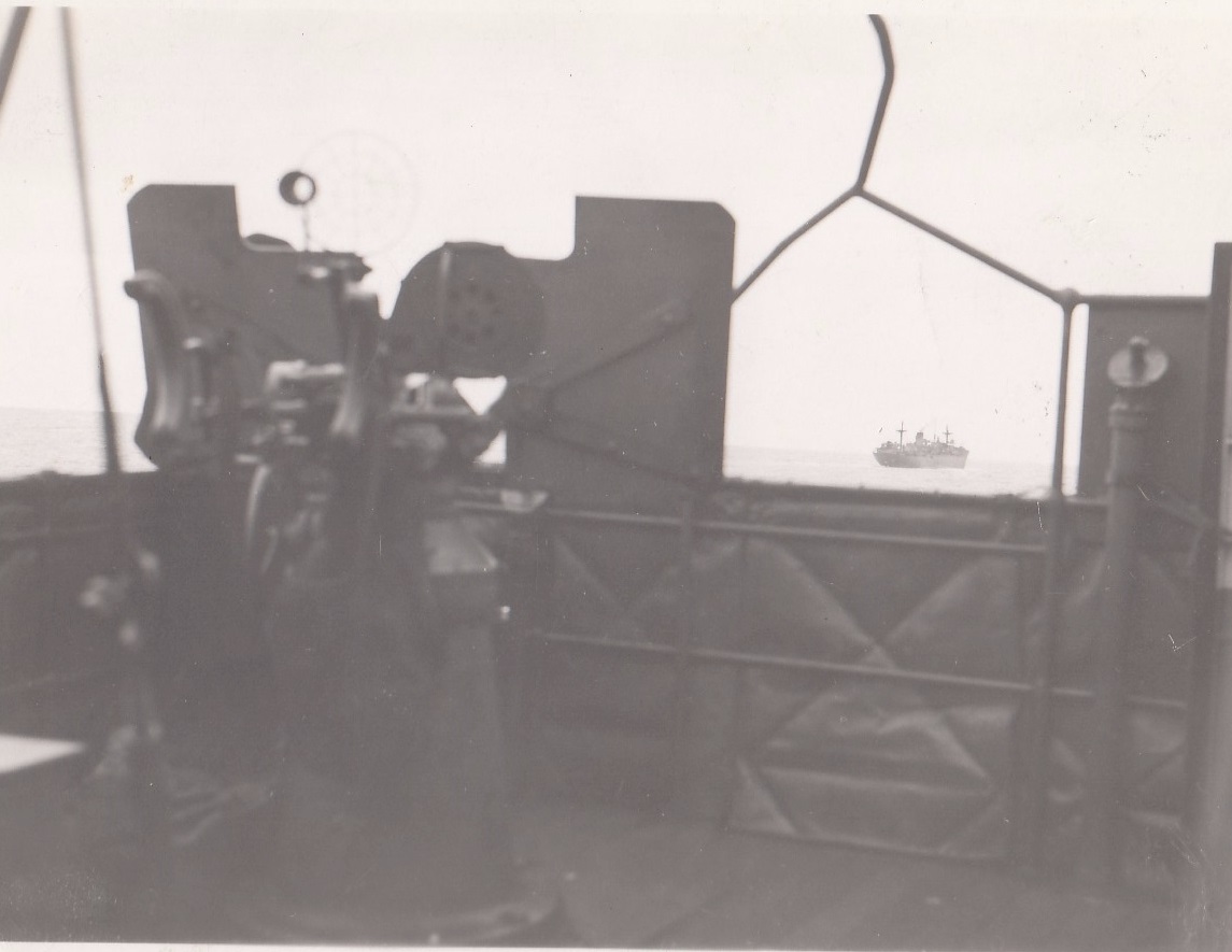 (GFW010) PO George Woods on HMCS TIMMINS (GFW011) .5 cal on HMCS TIMMINS. Merchant ship visible in the distance. All photos courtesy of Eleanor Woods and family