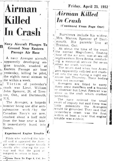 Lt Spencer died when his Avenger crashed near HMCS Shearwater in Eastern Passage, NS shortly after take-off.