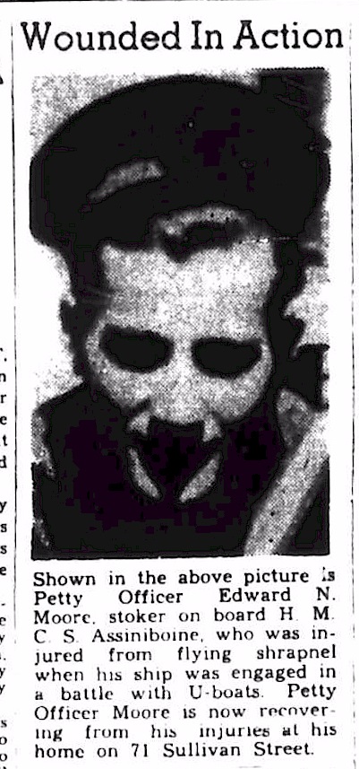 MOORE, Edward Neville - born in Hamilton, ON to Arthur Neville and Mary McNeil Moore. He married Annie May Shanks, daughter of Francis Joseph and Mabel Elizabeth (Moore) Shanks on 11 Oct 1938 in Halifax. Edward was wounded while serving in HMCS Assiniboine when she was in battle against U-210 in 1942.