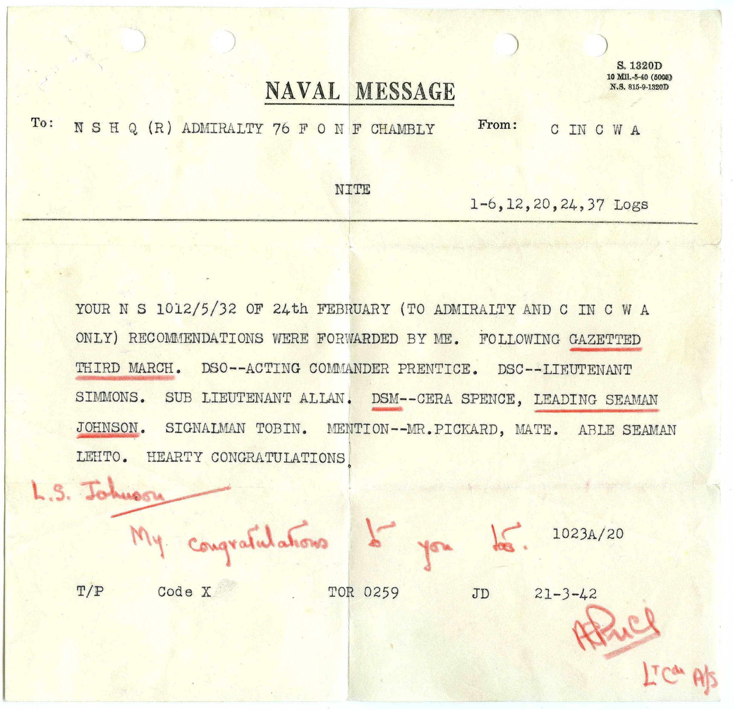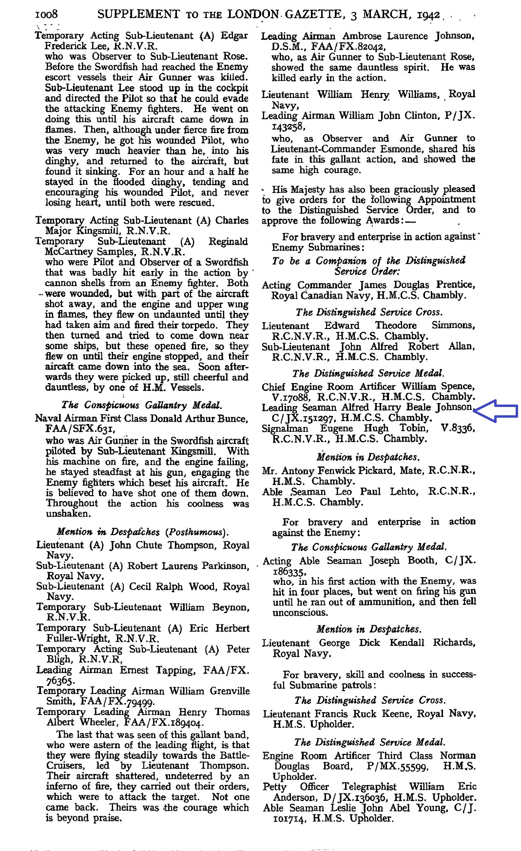 (AJ01) SD Johnson, 20 Apr 1941. Note: LS, 1st GC stripe and Marksman Badge (AJ02) Portrait of HSD Johnson, Nov 1941, Note: PO, HSD badge, 1st GC stripe (Square Rig PO) (AJ03) Supplement to the London Gazette, 3 March 1942 - Award of DSM to LS Alfred Harry Beale Johnson, HMCS CHAMBLY (AJ04) HSD Johnson, Nov 1941