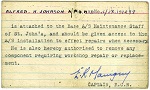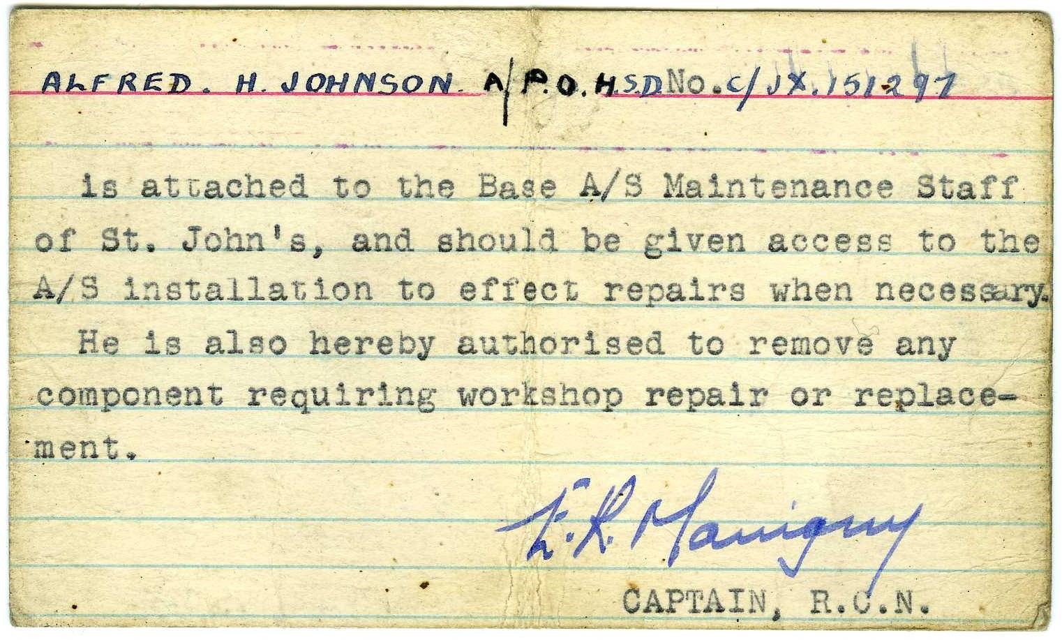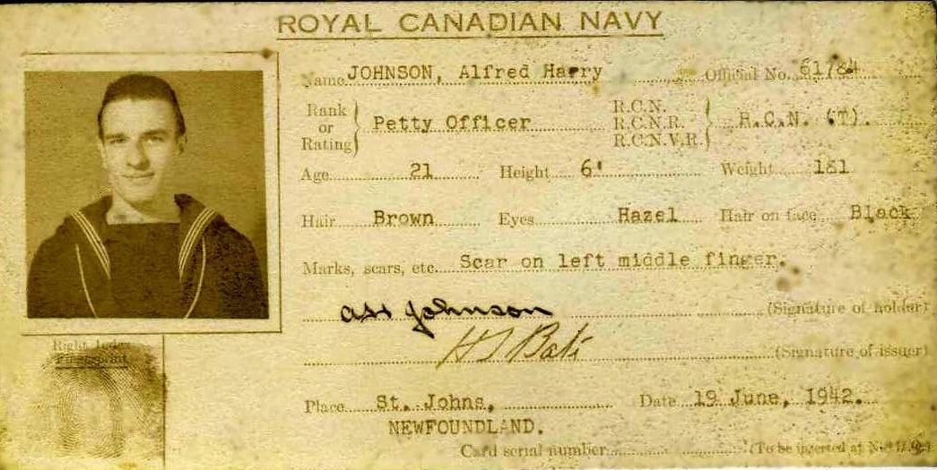 (AJ09) Alfred Johnson's RCN ID card (AJ10) Excerpt from the book "The Battle of the Atlantic" by Donald MacIntyre to read the prelude to the action in which HSD Johnson won his DSM.