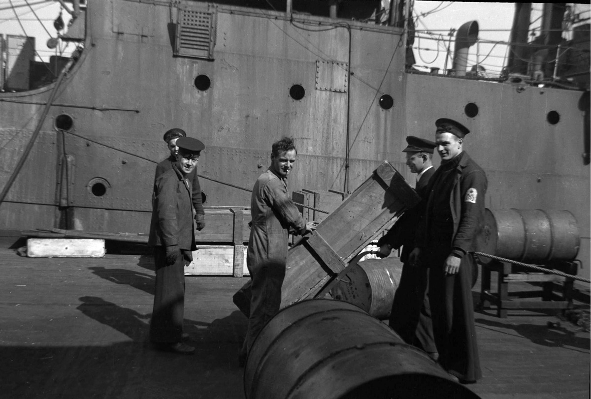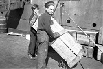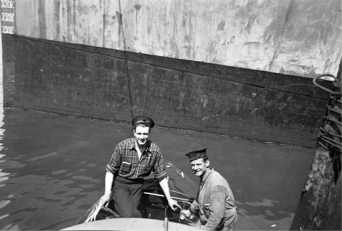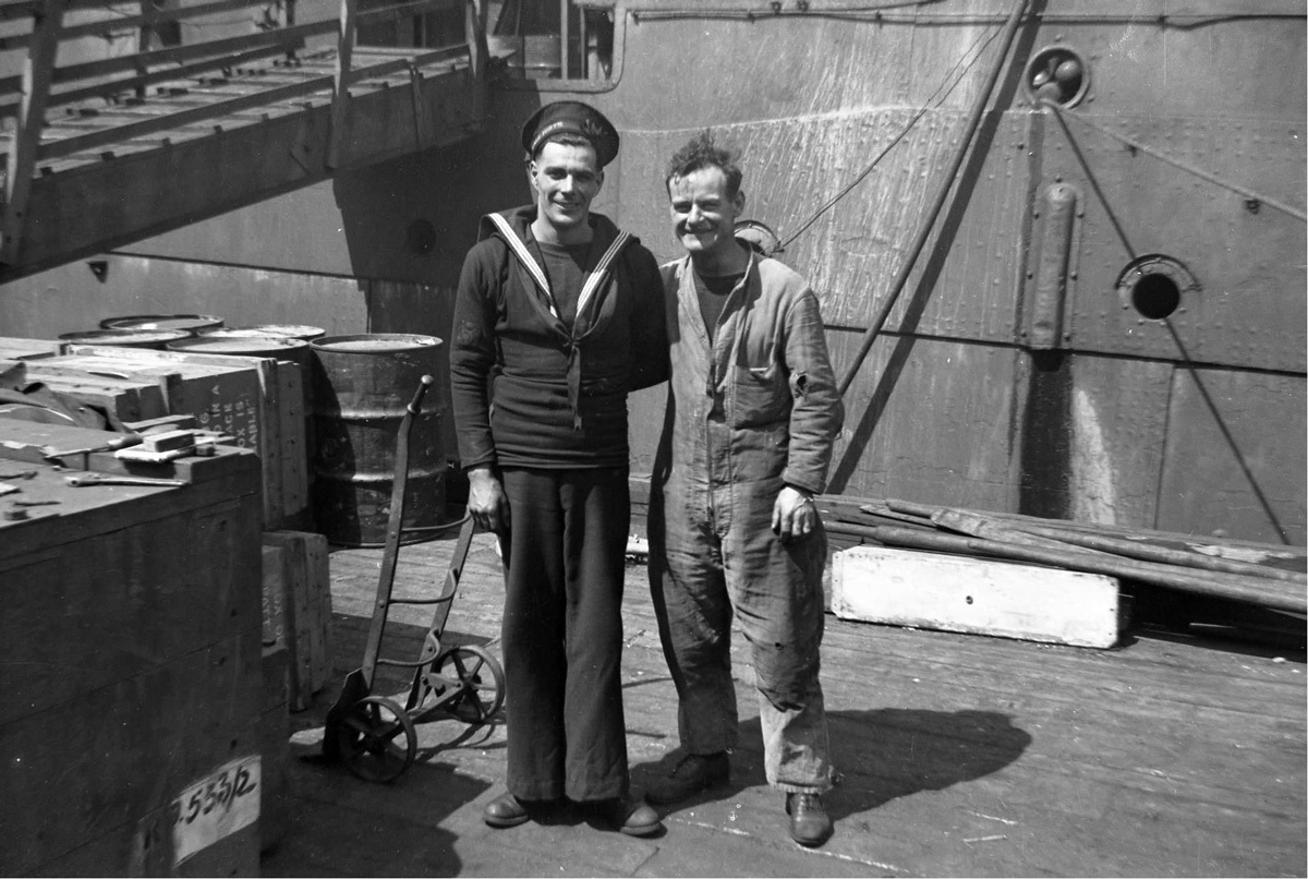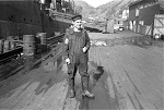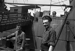 (AJ16) unknown sailors on dock in St. John's, NFLD - sailor on right wearing a RCNVR cap tally (AJ17) W. George (AJ18) W. Jelly (left) and A.H. Johnson (AJ19) W. Jelly (20) unknown sailors on dock in St. John's, NFLD