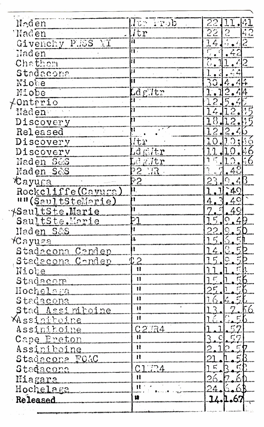 Ships served in: HMCS GIVENCHY (depot ship) Drafted to Givenchy 14 Apr 1942 as a Wtr, RCNVR, Add'l for York Island. Served at York Island 14 Apr 1942 - 04 Sep 1942. HMCS CHATHAM - Served at Chatham 08 Nov 1942 - 31 Jan 1944 as a Wtr, RCNVR HMCS ONTARIO - Served in Ontario 12 May 1945 - 13 Dec 1945 as a L/Wtr, RCNVR. Commissioning crew HMCS DISCOVERY - Demobilized 12 Dec 1945. Re-Engaged at Discovery 10 Oct 1946 HMCS CAYUGA - Served in Cayuga 23 Sep 1948 - 31 Dec 1948 as as P2WR, RCN HMCS ROCKCLIFFE (depot ship) - Drafted to Rockcliffe as a P2WR, add'l for HMCS Cayuga 01 Jan 1949 (01 Jan 49 - 03 Mar 1949) HMCS ROCKCLIFFE (depot ship) - Drafted to Rockcliffe as a P2WR, add'l for HMCS Sault Ste Marie 04 Mar 1949 (04 Mar 1949 - 06 May 1949) HMCS SAULT STE MARIE - Served in Sault Ste Marie 07 May 1949 - 21 Sep 1950 as a P2WR and P1, RCN HMCS CAYUGA - Served in Cayuga 15 Jun 1951 - 13 Aug 1942 as a P1AW, RCN for her 2nd Korean War tour. Listed on Cayuga's nominal roll for 30 Jun 1951 as a P1AW3 HMCS ASSINIBOINE - Served in Assiniboine 13 Jun 1956 - 02 Sep 1957 as a C2WR4, RCN. Commissioning crew HMCS CAPE BRETON - Served in Cape Breton 03 Sep 1957 - 21 Jan 1958 * Honourably released 14 Jan 1967 as a C1WR, RCN
