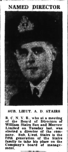 STAIRS, Arthur Drysdale - Served with the Royal Canadian Navy during World War II. President: William Stairs Son & Morrow Ltd. He is buried in the Fairview Lawn Cemetery, Halifax, NS.