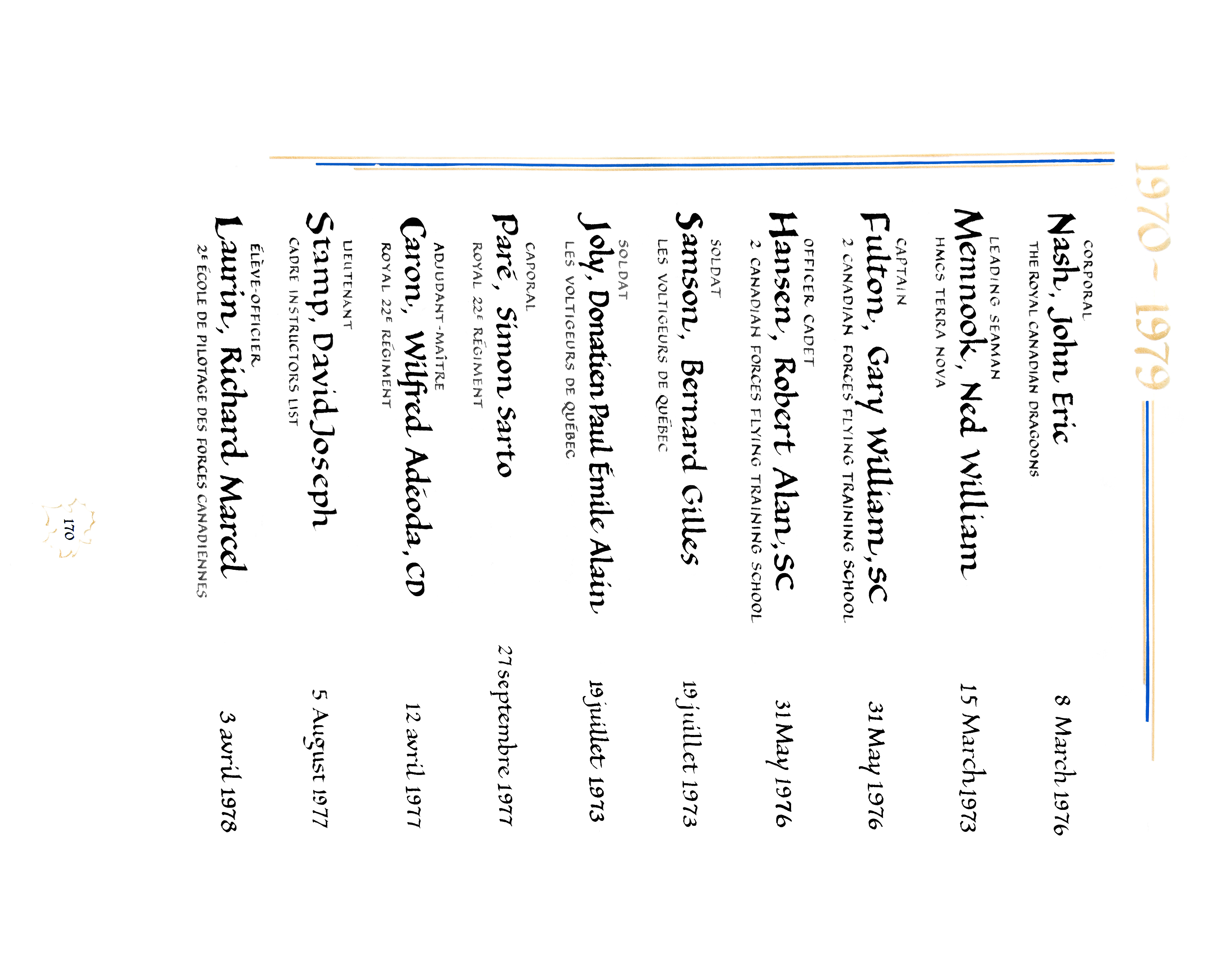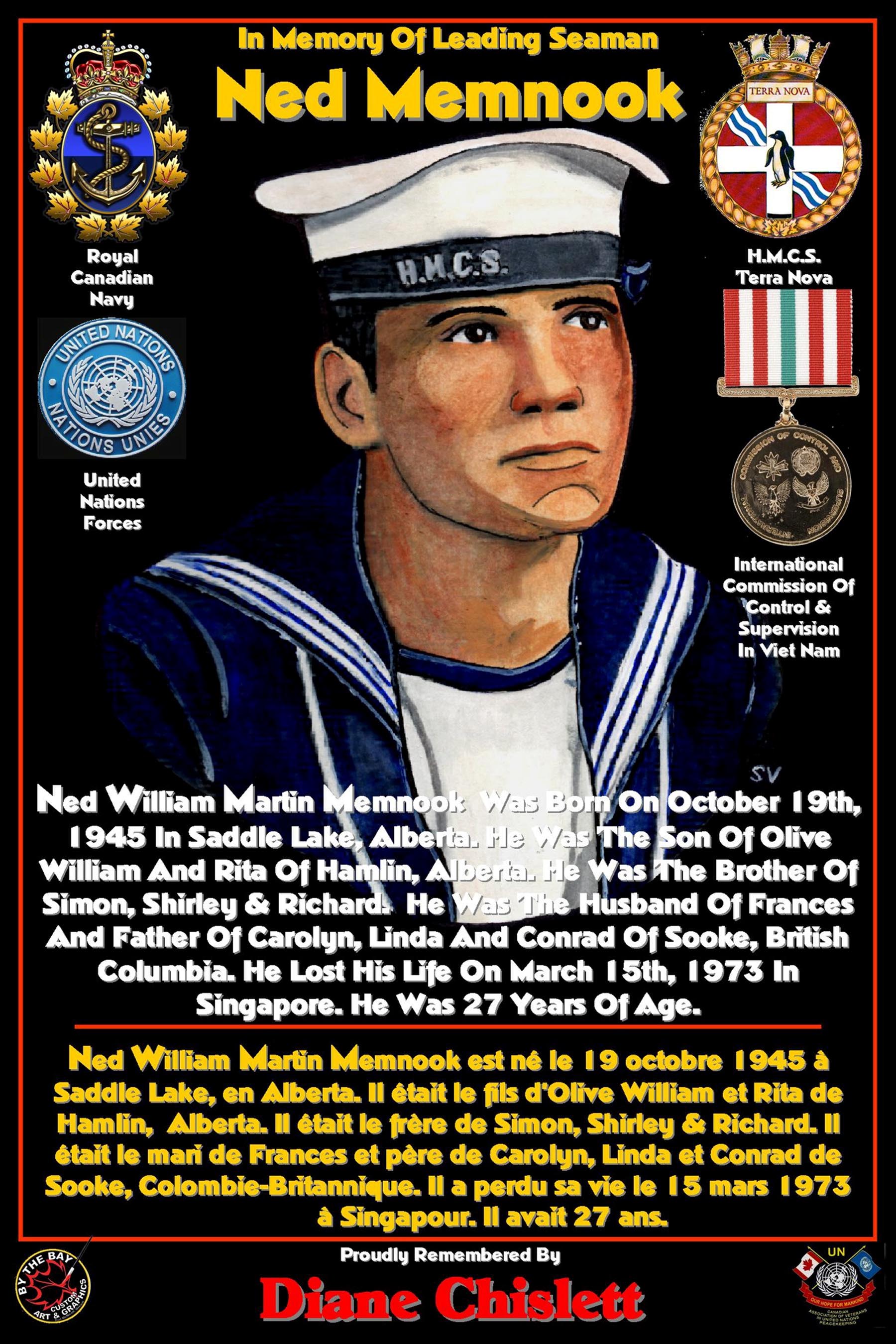 MEMNOOK, Ned William Martin, LS, 63119, RCN / C.A.F. died - 15 Mar 1973, HMCS TERRA NOVA - Born 19 Oct 1945, Saddle Lake, AB, son of Olive William and Rita (nee Halfe) of Hamlin, AB. Brother of Simon, Shirley and Richard. Husband of Frances (née Lucas) Memnook and father of Carolyn Memnook, Linda and Conrad Lucas of Sooke, BC.