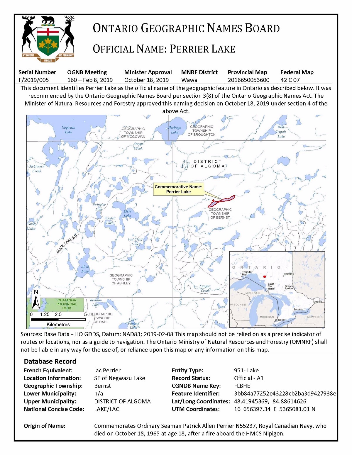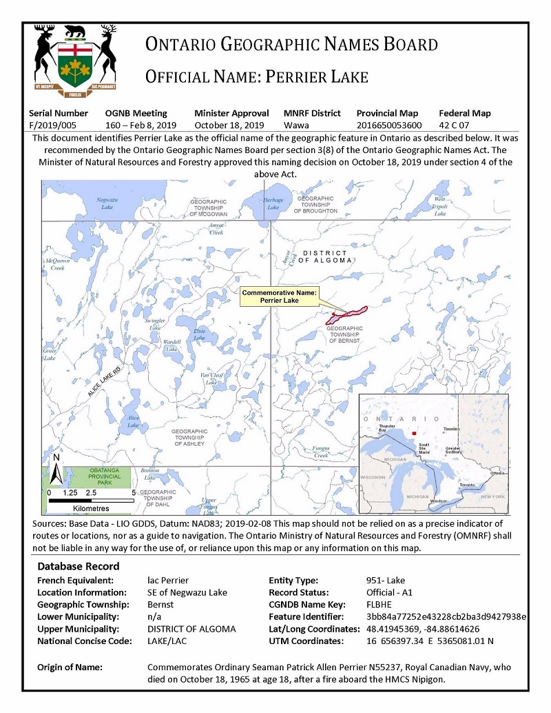 Naming Certificate naming Perrier Lake, Ontario in honour of OS Patrick Perrier Click on the above photo to view a larger image