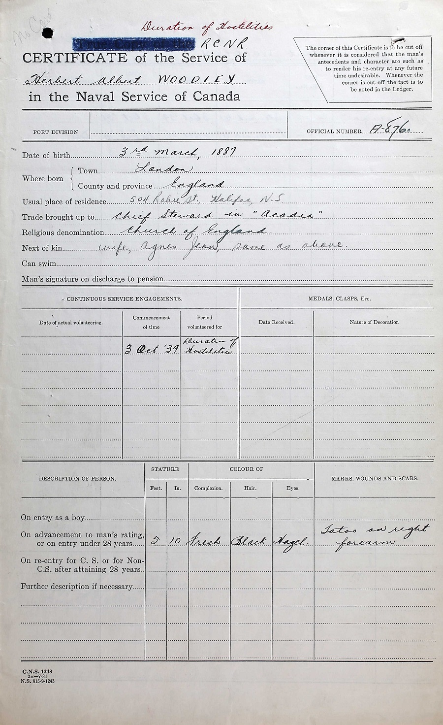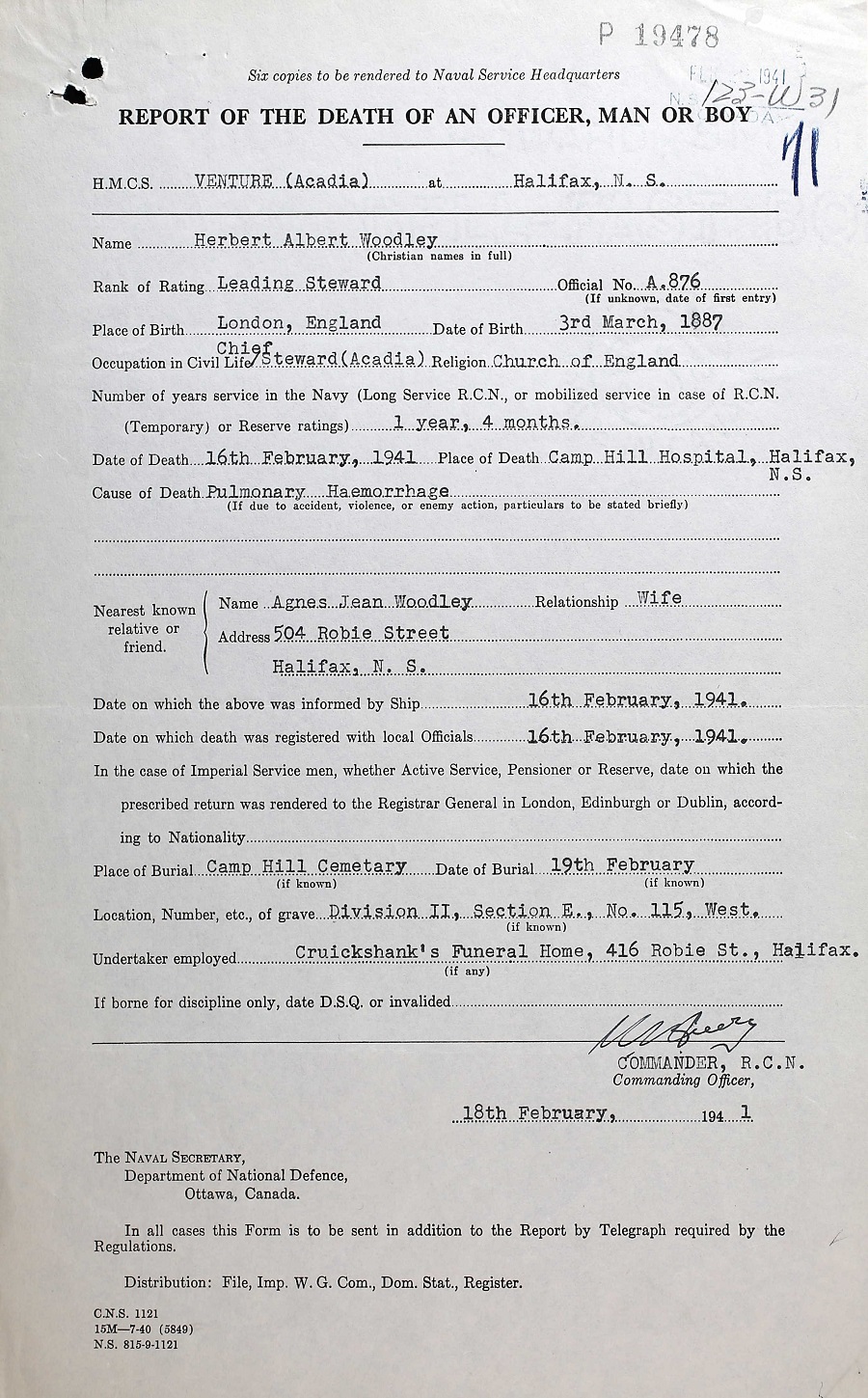 WOODLEY, Herbert, Leading Steward, RCNR, died - 17 Feb 1941, HMCS ACADIA - Son of George and Rosa Woodley, London, England; husband of Agnes Jean (née Harnish) Woodley, Halifax,, NS; father of Herbert Allsey (30), Rosa Leina (28), George Thomas (26) and Beatrice Ester (26).