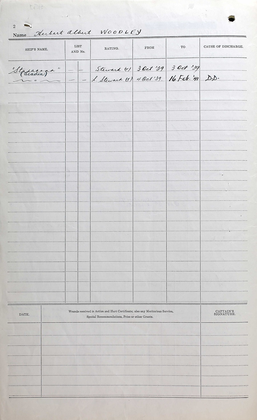 Ships served in: HMCS ACADIA - Drafted to Acadia as a Steward, RCNR 03 Oct 1939. Rated L/Stwd 04 Oct 1939 (advanced). Served in Acadia as Chief Steward.