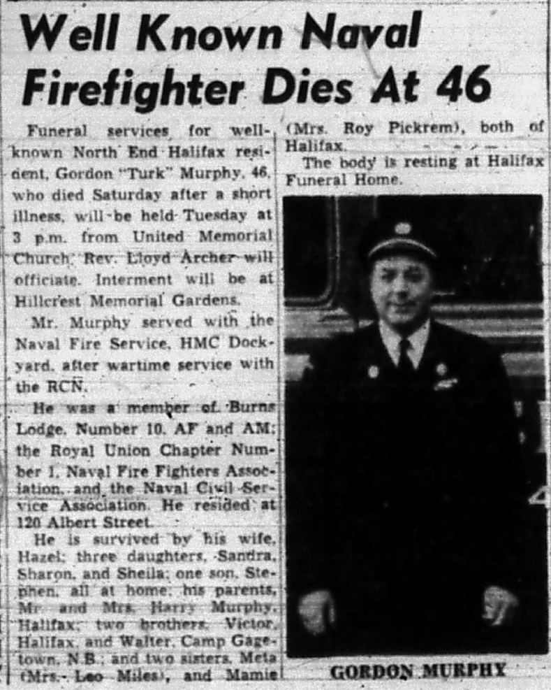 Gordon (Turk) Murphy Well Known Naval Firefighter Died At Age 46 Halifax Mail Star, Monday, 11 Mar 1963 Researched by / Courtesy of George Newbury