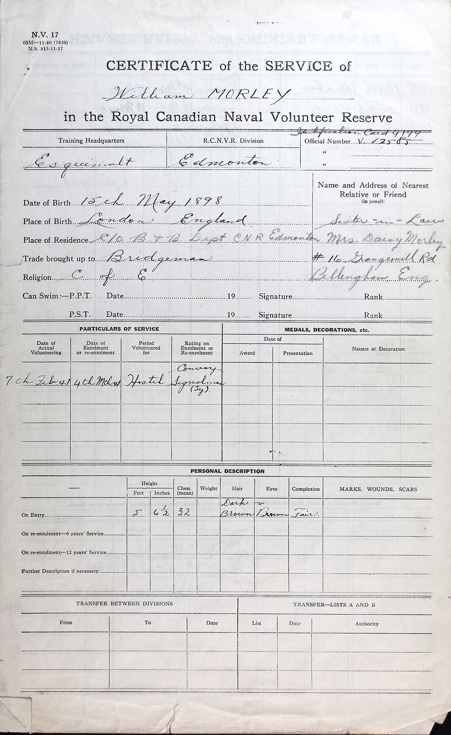 MORLEY, William, Convoy A/Leading Signalman, V12585, RCNVR, died 27 Nov 1941 - Next-of-Kin: Mrs. Daisy Morley, sister-in-law, 16 Granemill Road, Bellingham, England