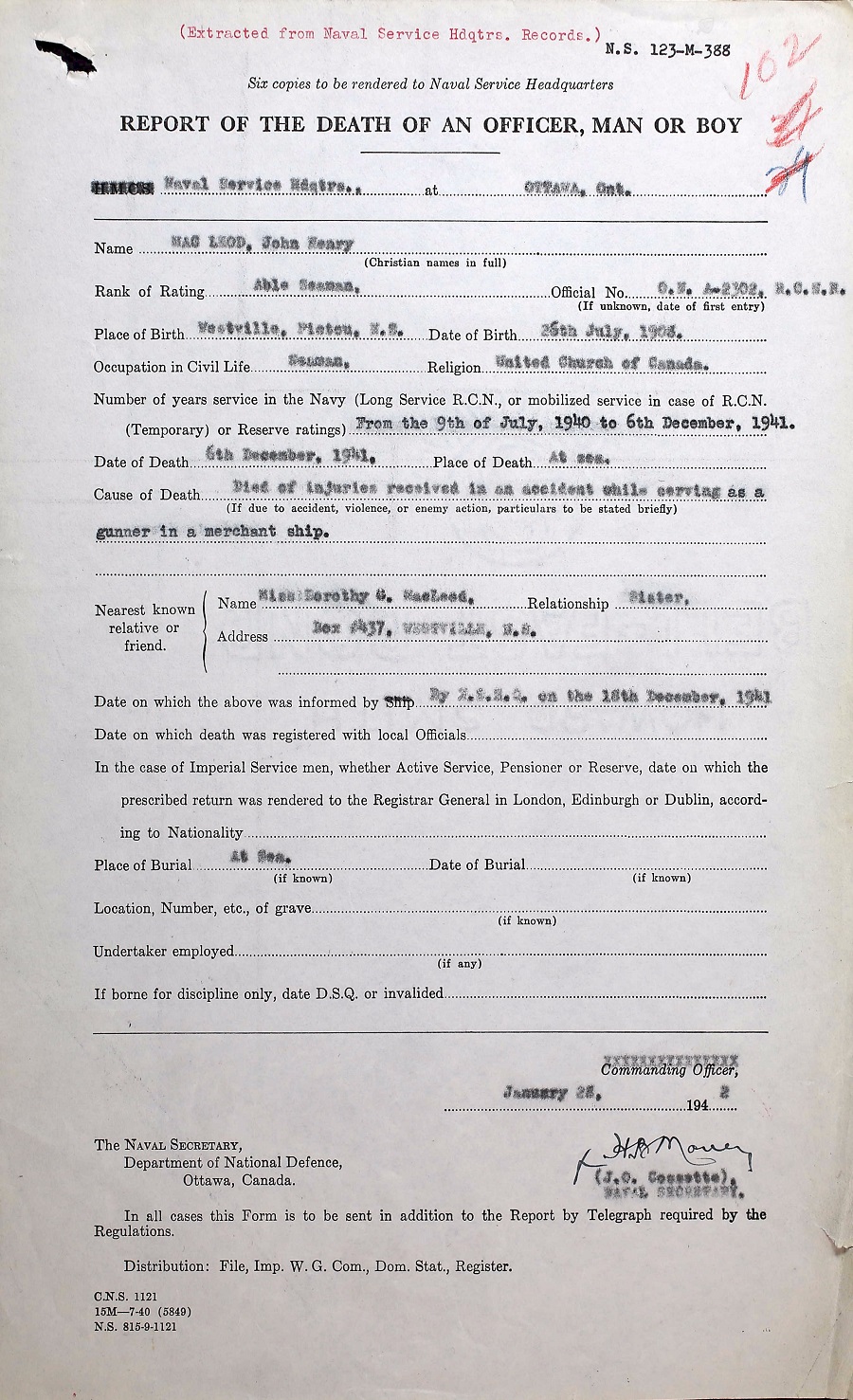 Able Seaman John Henry MacLeod joined the R.C.N.R. on July 09, 1940 and was a seaman on the Great Lakes before enlisting. He was a D.E.M.S. on M.V. Koenjit and died accidentally while serving as a gunner. He was injured as a result of falling in heavy seas and hitting his head on a 3" high iron border on the deck. He was taken to sick bay, he remained unconscious and was bleeding from his nose, mouth and ears, and he passed away that night. He was buried at sea.