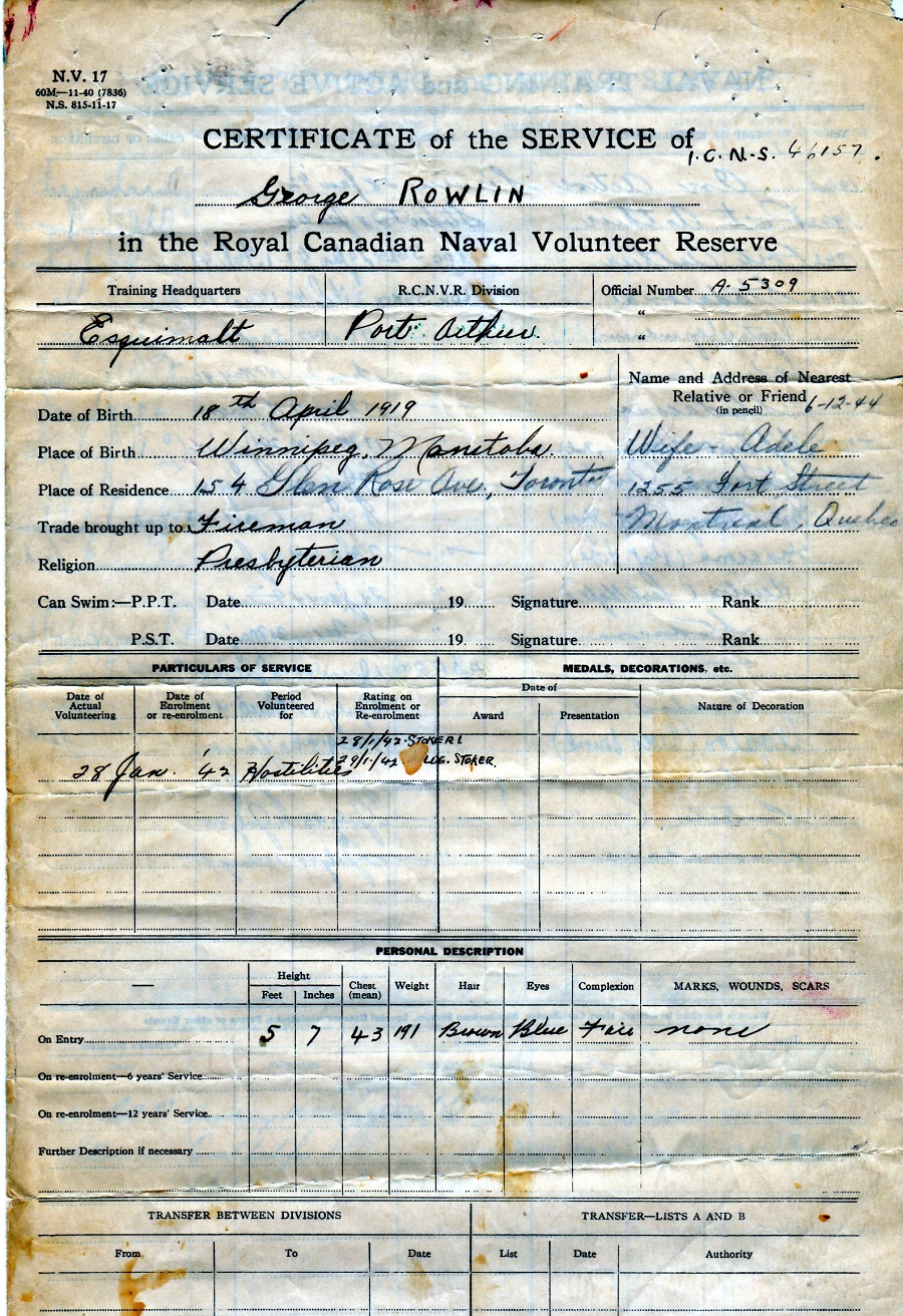 (GR01) LS George Rowlin - 1942  (GR02-03) Certificate of Service  (GR04) Newspaper article on HMCS PORT HOPE being adopted by the town of Port Hope, Ontario  (GR05) HMCS OWEN SOUND jacket patch  (GR06) PO George Rowlin