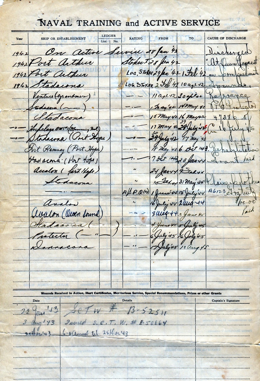HMCS DONNACONA - Drafted to Donnacona 17 Jul 1945. Honourably released 10 Aug 1945