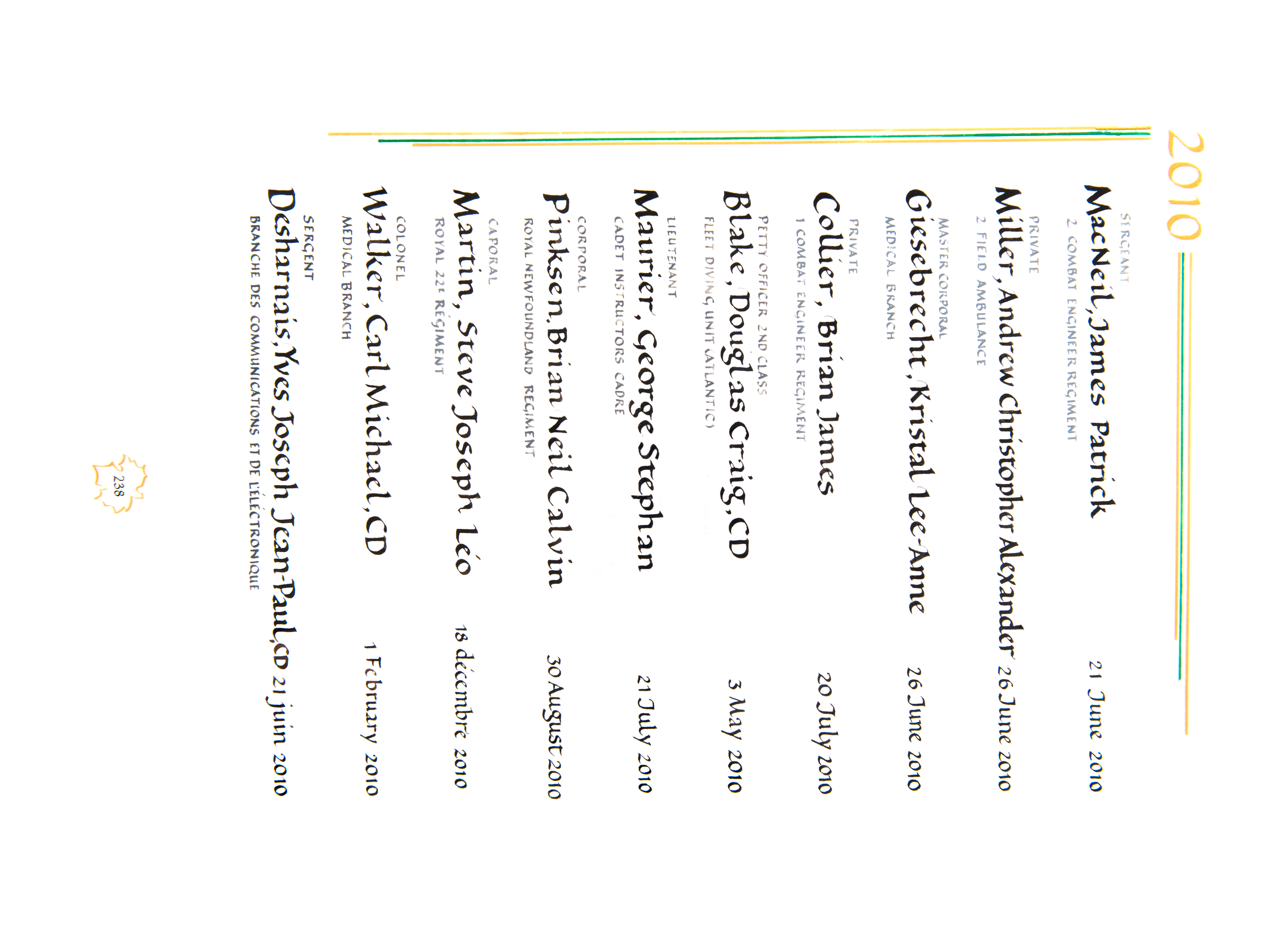 Awards and Decorations: Canadian Forces Decoration, UN Protection Force (Yugoslavia) (UNPROFOR), Canadian Peace Keeping Service Medal, (CPSM), General Campaign Star – SOUTH-WEST ASIA (GCS-SWA) and bar, Sacrifice Medal.