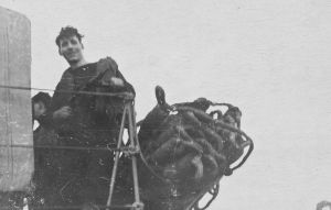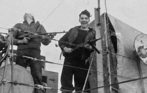 Ships served in: (GBW01) Gerald Wilkes holding a Sten submachinegun while guarding prisoners taken after sinking U-877 in December of 1944. (GBW02) Gerald Wilkes (right), armed with a Sten submachinegun guarding prisoners with a shipmate (left) armed with a Bren light machinegun.