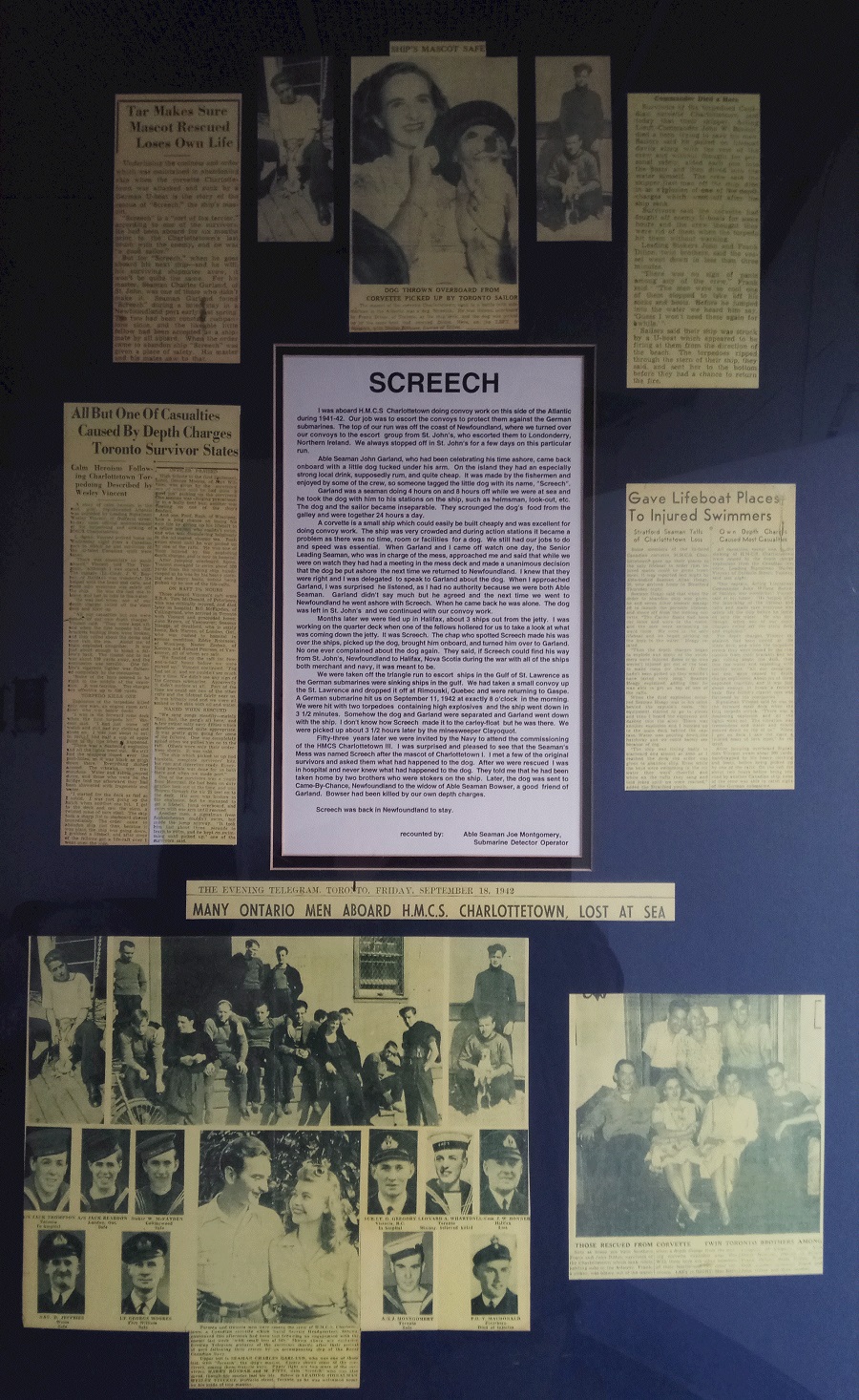 * The story on Screech is posted with a collage of articles and photos on the loss of HMCS CHARLOTTETOWN K244 (1st of name) on the door to the Junior Ranks mess on HMCS CHARLOTTETOWN 339 (3rd of name).