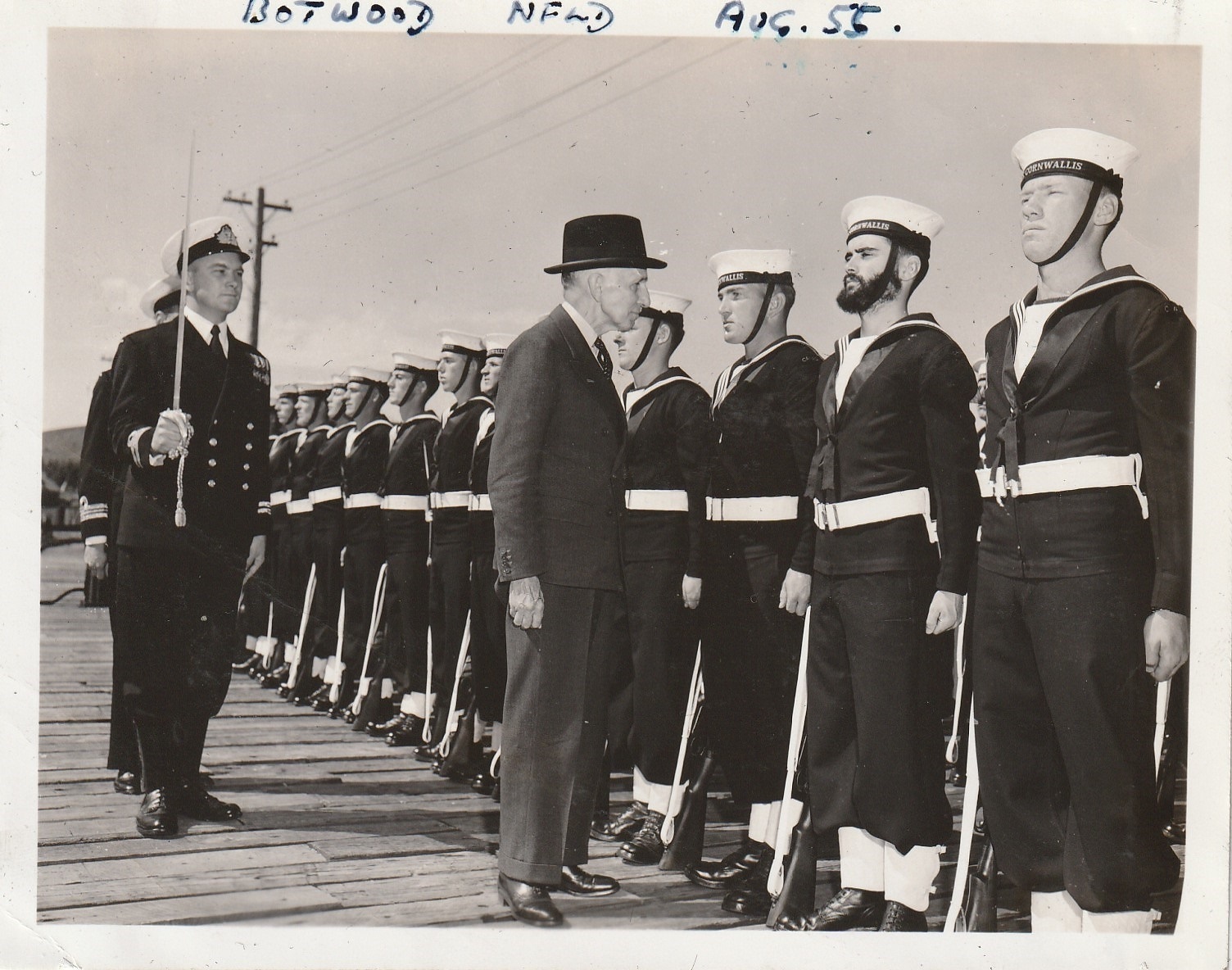 LCdr Gerry Hill, Guard Officer escorting Governor General Vincent Massey at Botwood, Nfld. in Aug 1955.