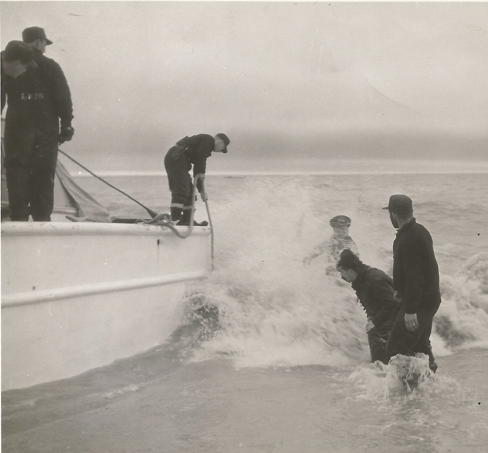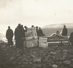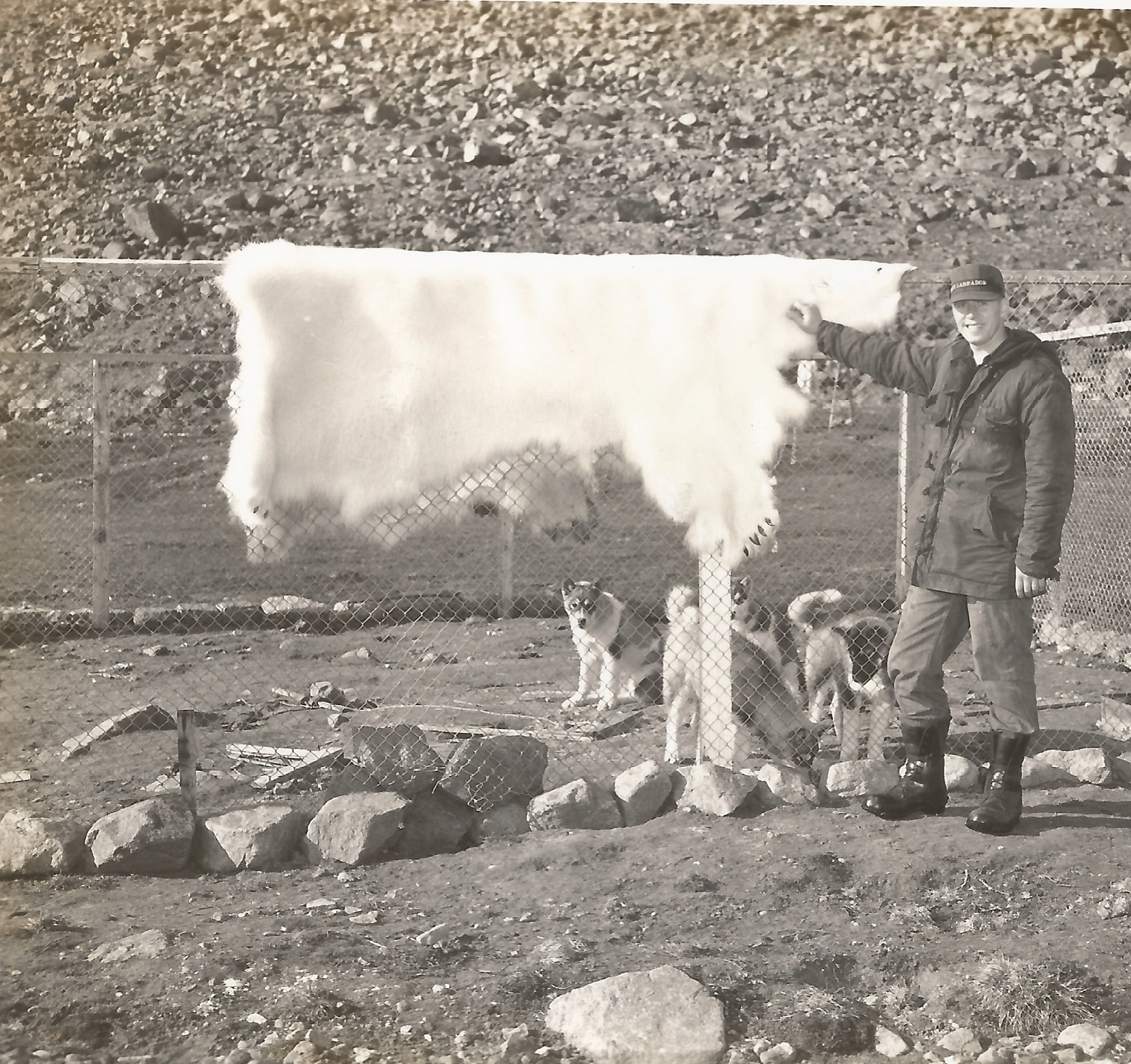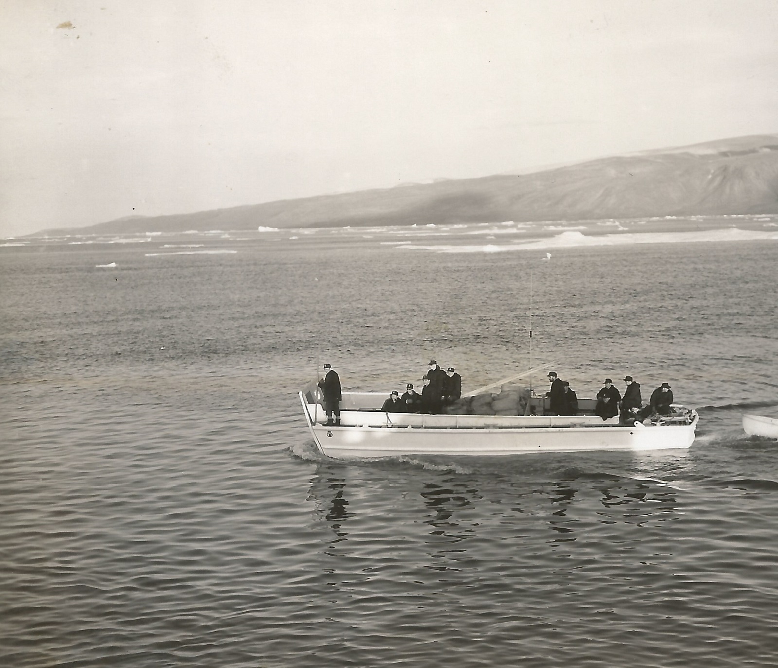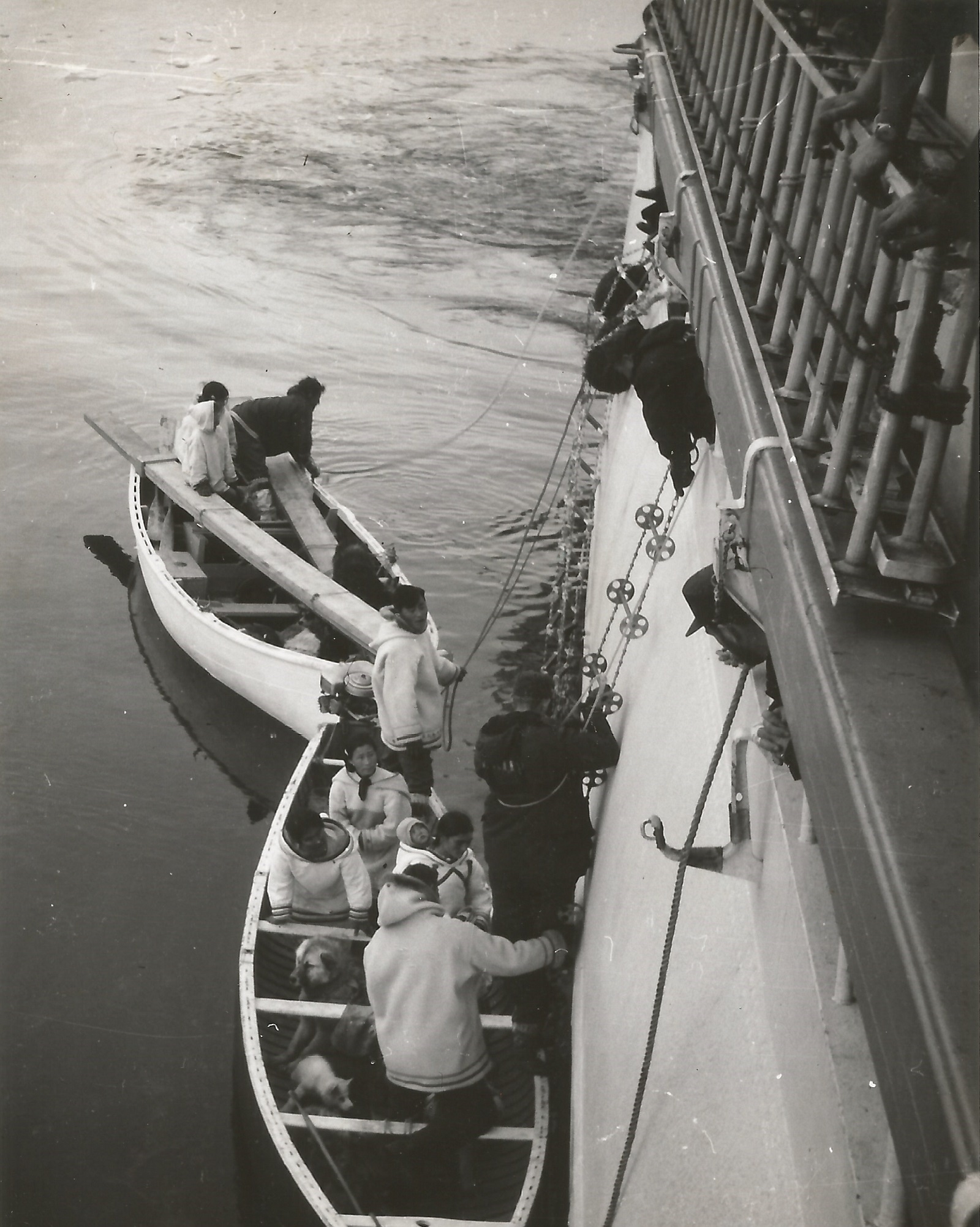 (AM86-AM87) Supplies being transferred from LABRADOR to smaller craft for local Eskimos (AM89) Sailor from LABRADOR by sled dog pen with Polar bear hide (AM90) HMCS LABRADOR's boat - HMCS POGO