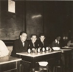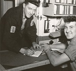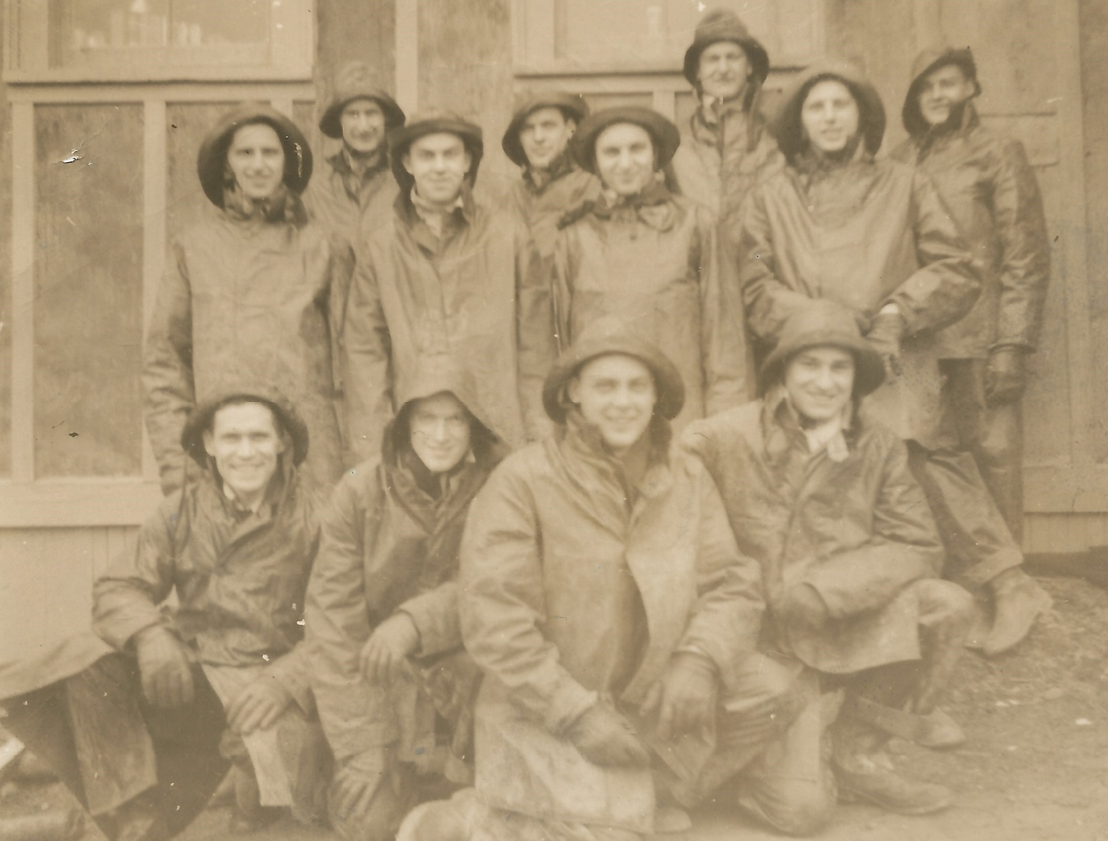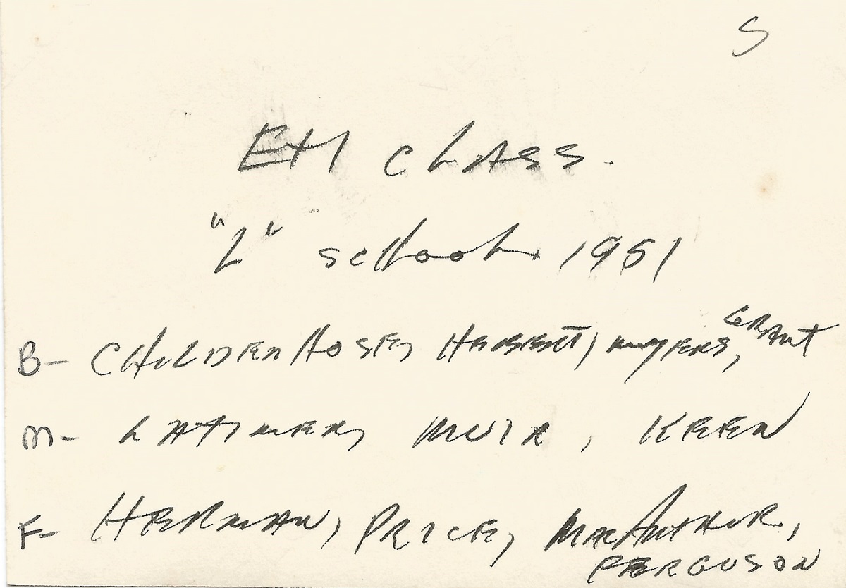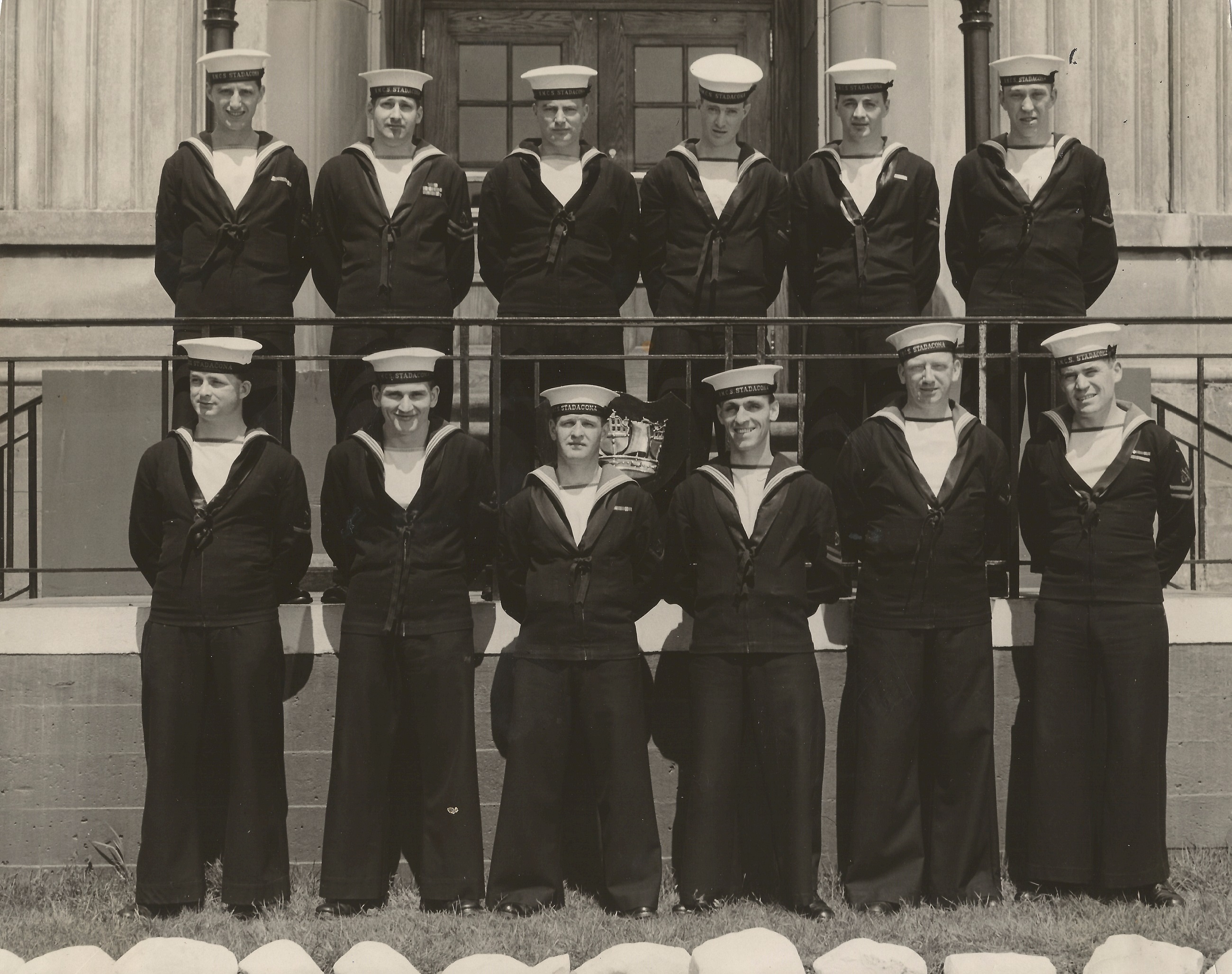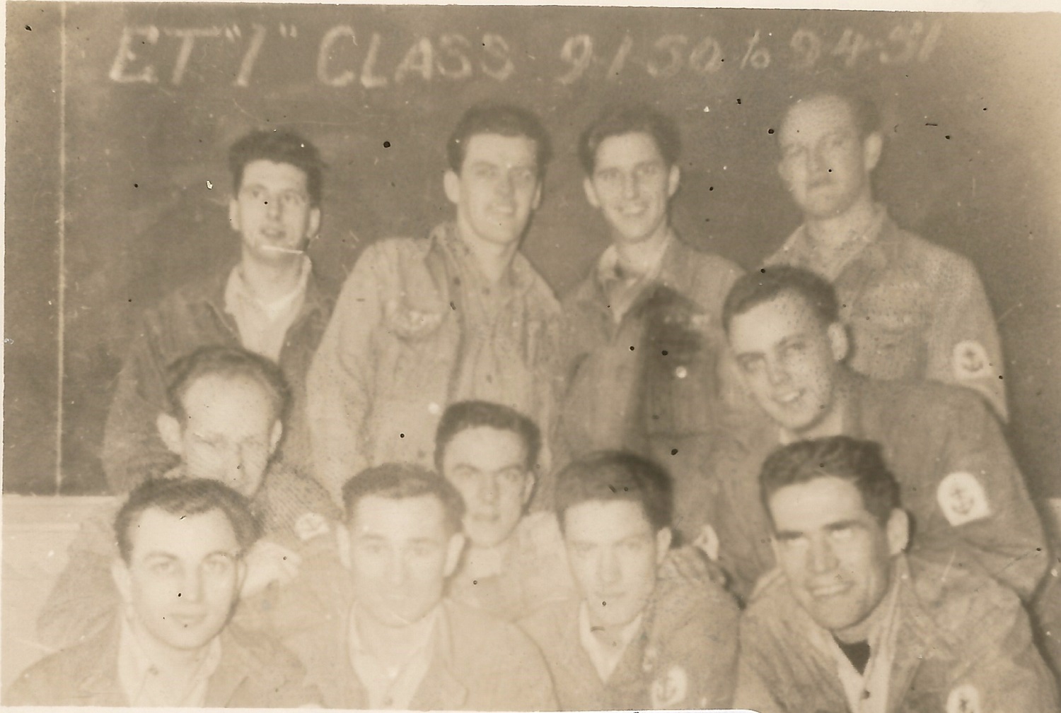 (AM13) HMCS STADACONA, "C" block - L-R: unknown, Len Keen, Archie MacArthur (AM14) HMCS STADACONA, ET"1" Class, "L" School - 09 Jan 1950 - 09 Apr 1951 (AM15) Names on back of photo "AM14" (AM16) Damage Control School training (AM17) Sonar Class - Archie MacArthur - left front (AM18) ET'1" Course - Graduation