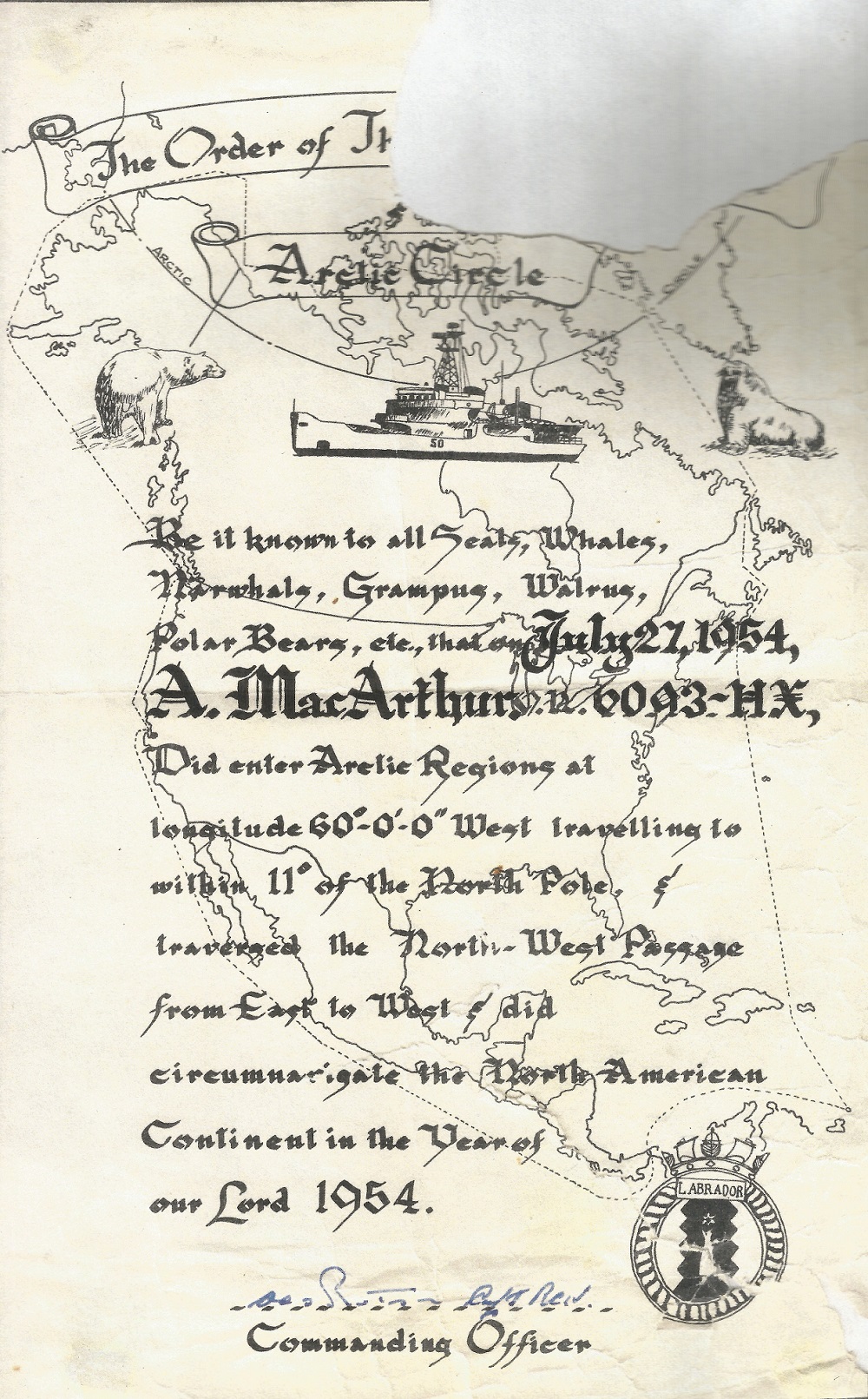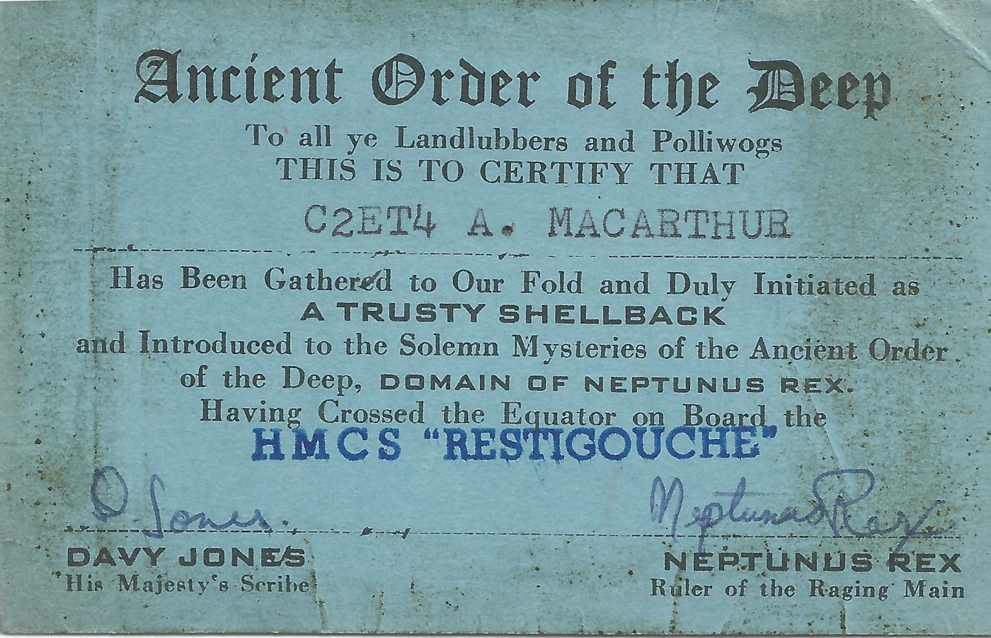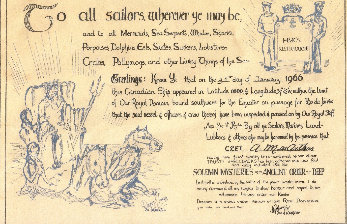 (AM111) CANCORTRON 3 - MAPLE SPRING 66 Certificate - HMCS ANNAPOLIS, HMCS RESTIGOUCHE, HMCS SKEENA (AM112) HMCS RESTIGOUCHE 257 - Crossing the Line (Equator) booklet - 31 Jan 1966 (AM113) Chief MacArthur's Crossing the Line Certificate - 31 Jan 1966 (AM114) Chief MacArthur's Crossing the Line certificate - wallet size card. Note: If a ship crossed the line and a sailor was not able to produce his card or certificate that he had been initiated, then he would have to go through the ceremony again as a tadpole