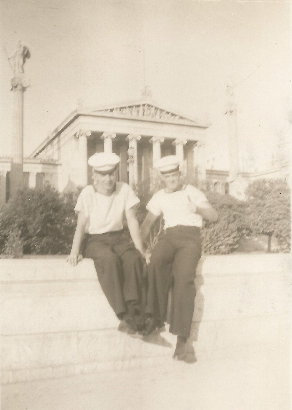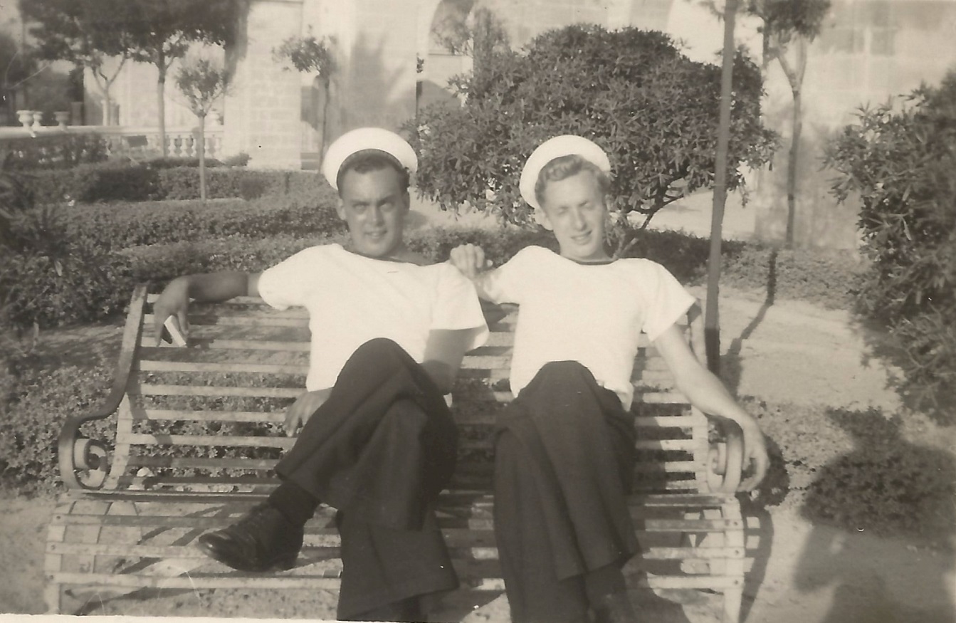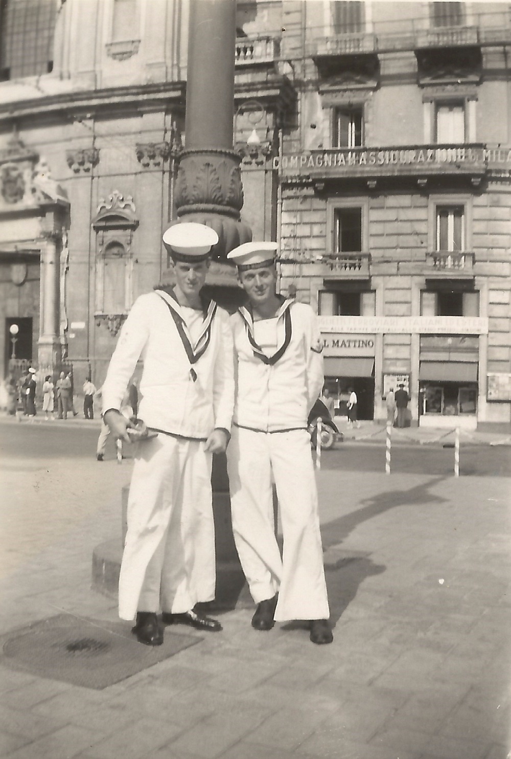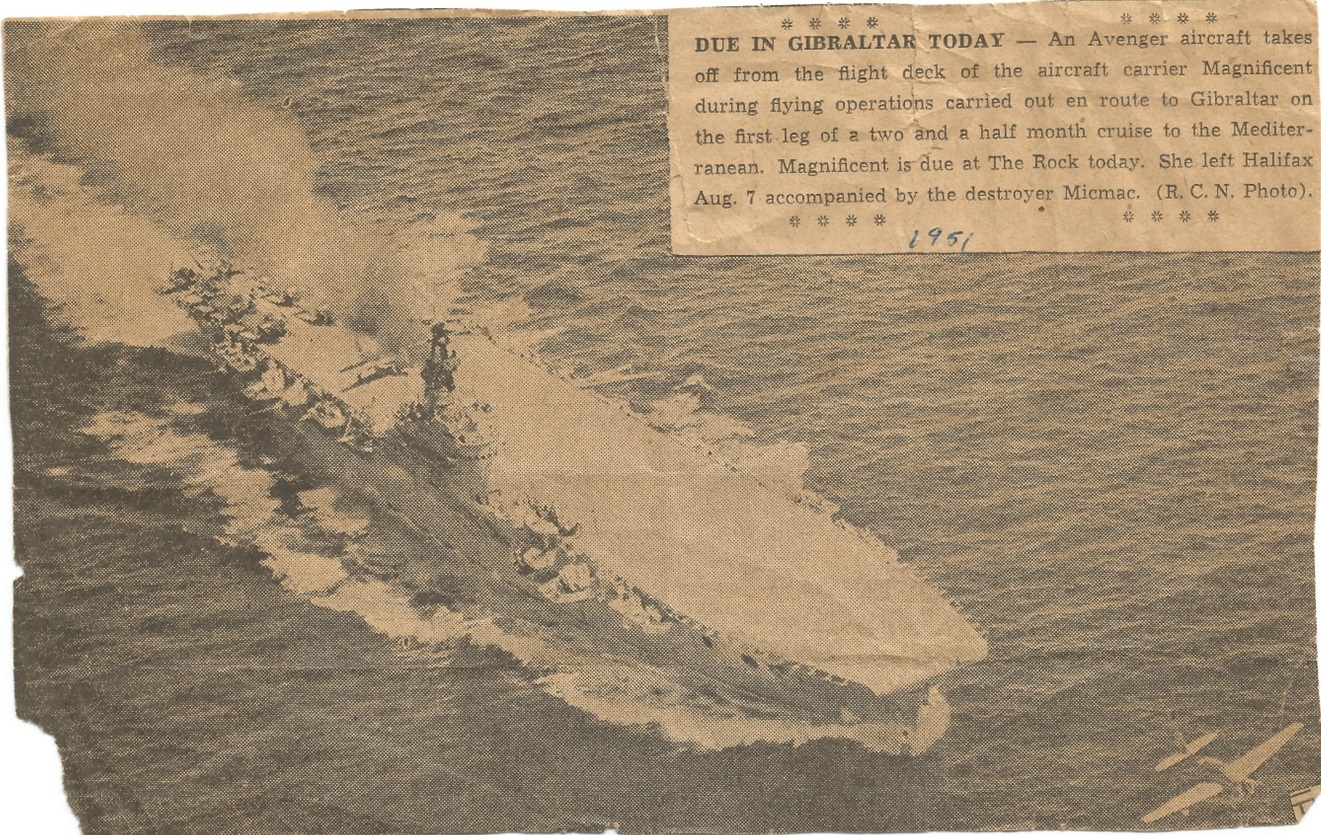 (AM41) Lee Stewart and Archie MacArthur - 1951 (AM42) Pompeii, Italy - Archie MacArthur in middle (AM43) newspaper article on 1951 cruise to Mediterranean (AM44) MacElvoy on HMCS MAGNIFICENT- date unknown (AM15) Entrance to Valetta, Malta