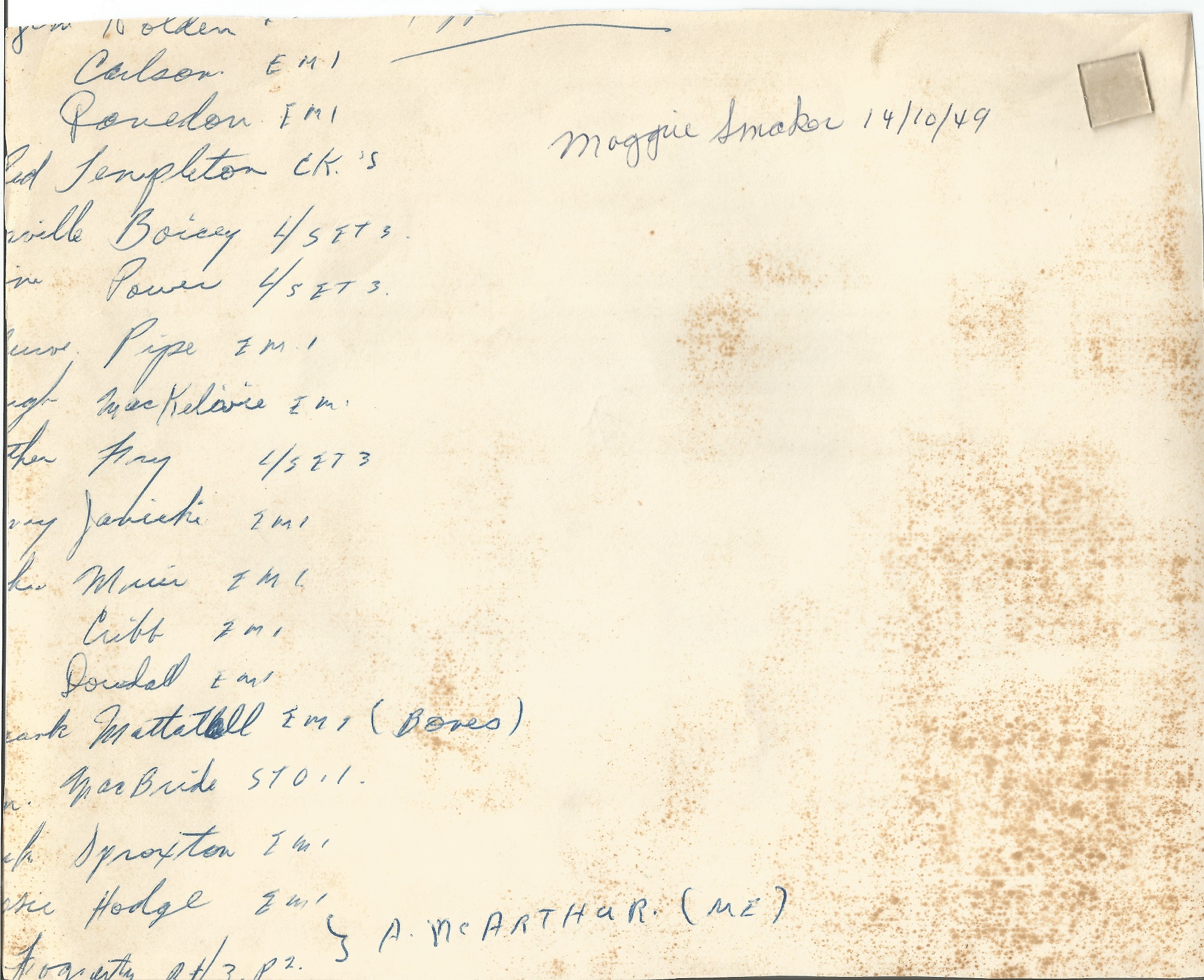 (AM21) Frank Mattatal on HMCS MAGNIFICENT - 1949 (AM22) Smoker on HMCS MAGNIFICENT - 14 Oct 1949 (AM23) MAGGIE Smoker - names on back of photo (AM24) HMS VICTORY - 1950 (AM25) Archie MacArthur on HMCS MAGNIFICENT - 1949