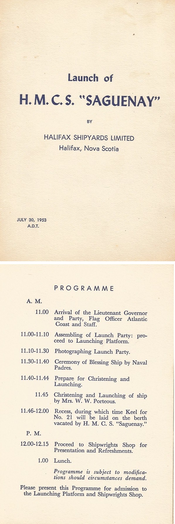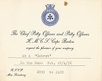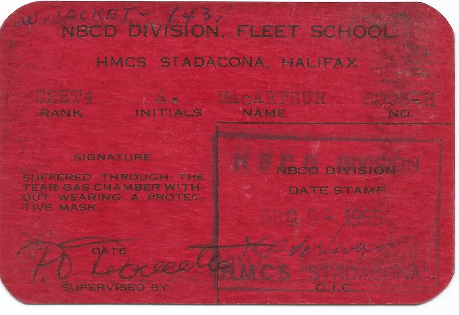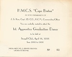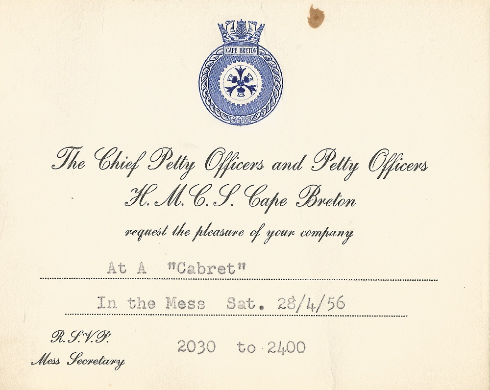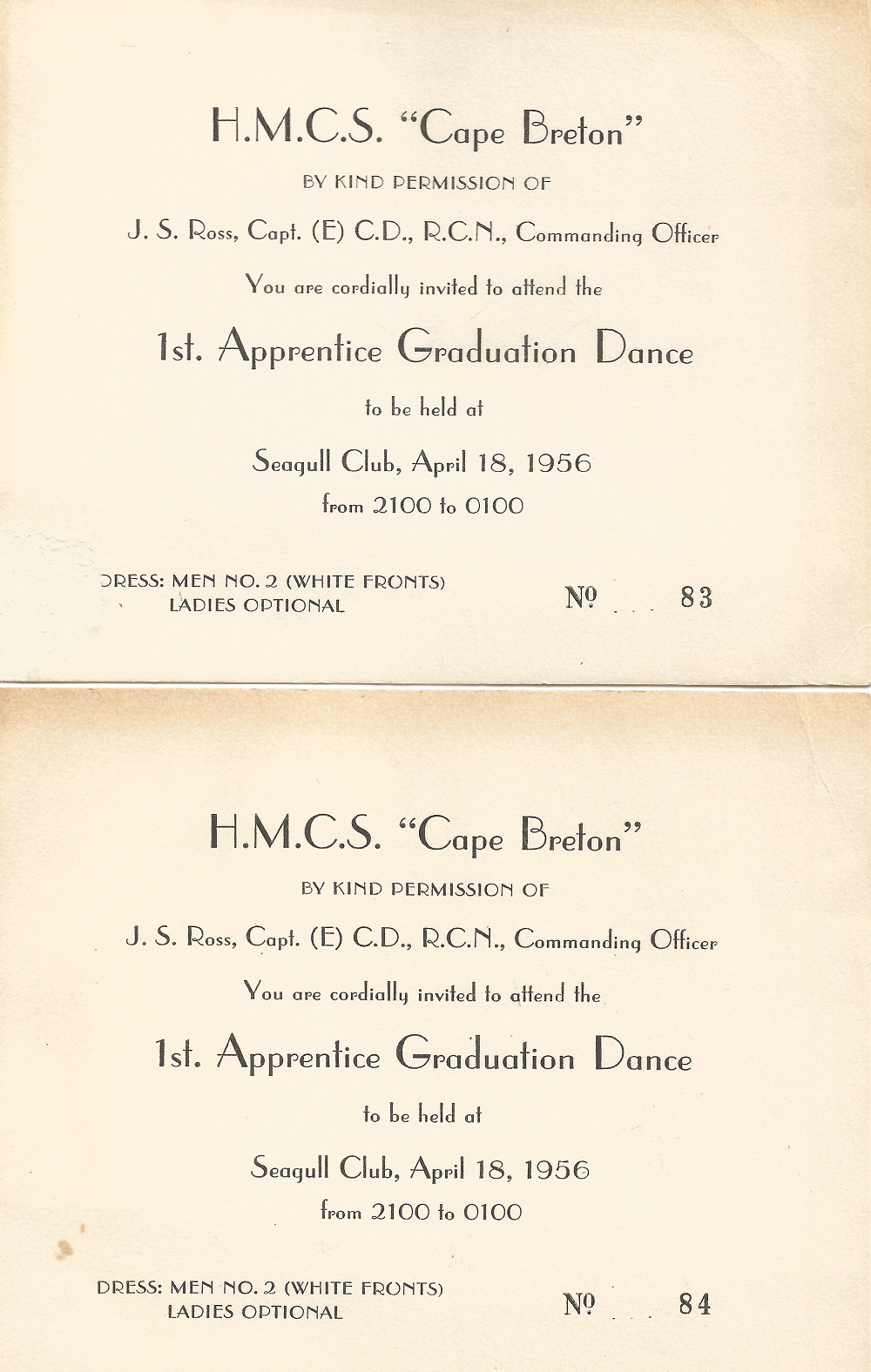 (AM01) Archie and Ora MacArthur at a dance at a Nova Scotia hotel - 1951 (AM02) Launch of HMCS SAGUENAY programme - 1953 (AM03) Arctic Cruise Certificate - HMCS LABRADOR - 1954 (AM04) Tickets to the first HMCS CAPE BRETON Apprentice Graduation Dance - 18 Apr 1956 (AM05) Invitation to HMCS CAPE BRETON C&POs "Cabret" 28 Apr 1956 (AM06) NBCD School Gas Hut qualification card.