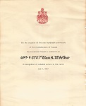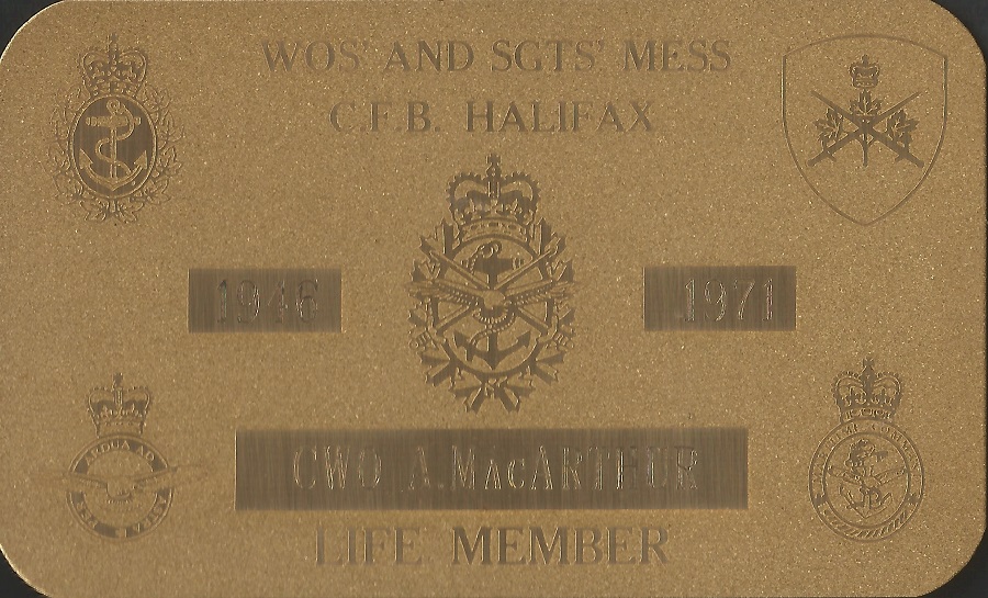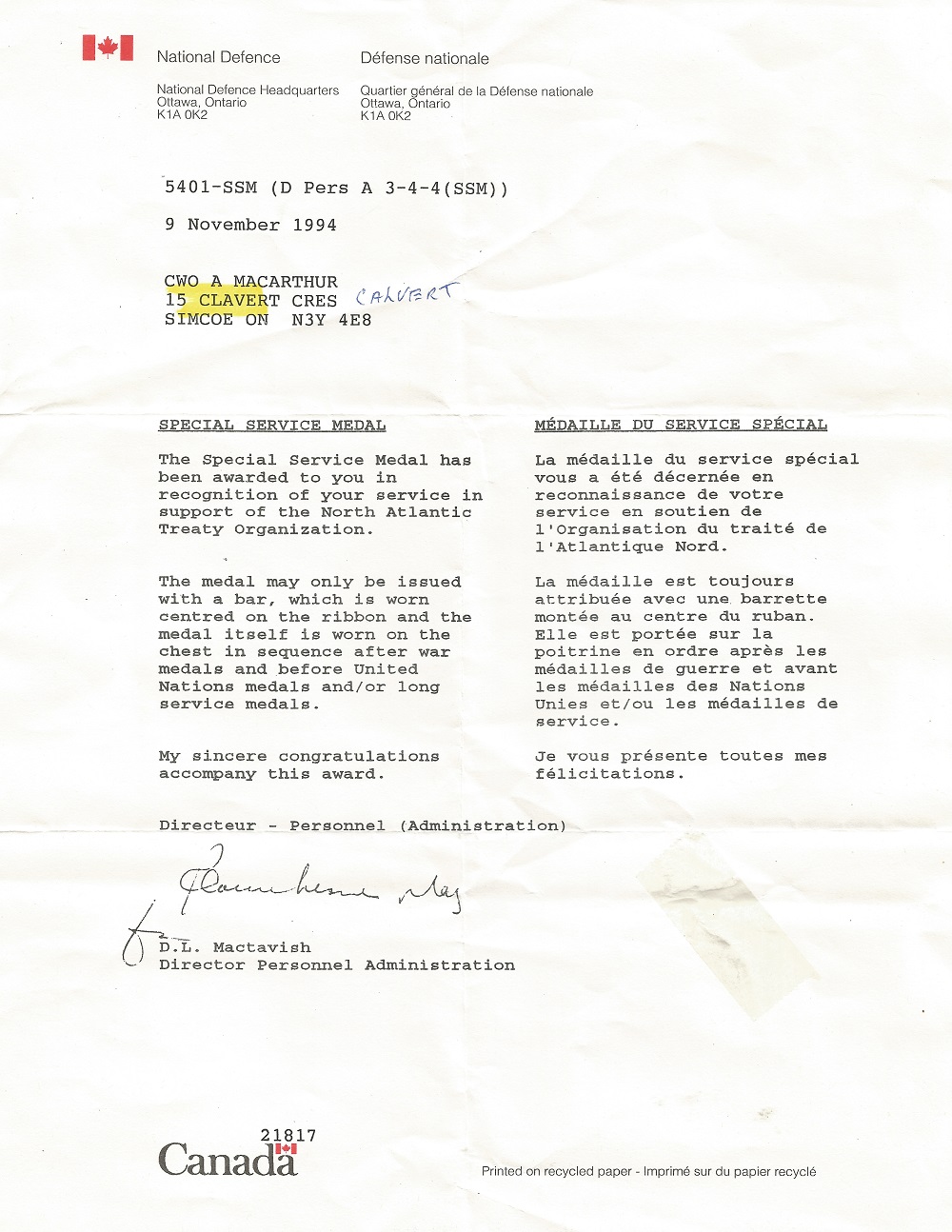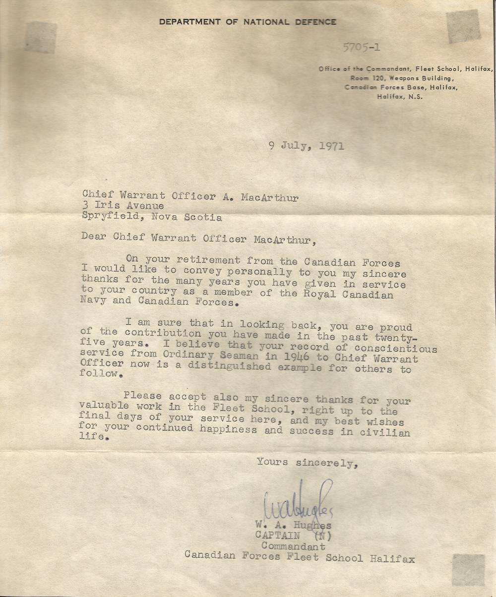 (AM07) Stadacona - Miss Arbuthnot, Archie MacArthur, Manuge, and Rowat (AM08) Certificate for the award to the Canada Centennial Medal to CPO MacArthur - 1967 (AM09) Letter to CPO MacArthur from the Commandant of CFFS(H) on the occasion of his retirement (AM10) Life Membership Mess Card, CFB Halifax (AM11) Newspaper article - The RCN in its heyday - 1985 (AM12) Letter notifying CPO1 A. MacArthur that he has been awarded the SSM for his service during NATO deployments - dated 09 Nov 1994