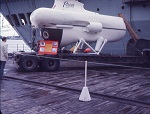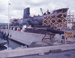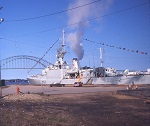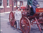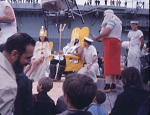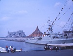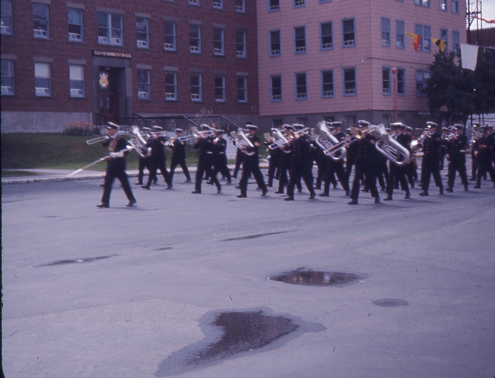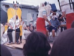 (AM175) Naval band plays in HMC Dockyard for Family Day (176) Ora MacArthur beside old fire department wagon (177) Toot - dockyard tour train - Family Day (AM178) RCN's submersible PIECES (179) Webmaster's note - looks like a sailor jumping into the harbor for a man overboard demonstration for Family Day - HMCS BONAVENTURE on the right (AM180) HMCS ONONDAGA on the synchrolift for refit