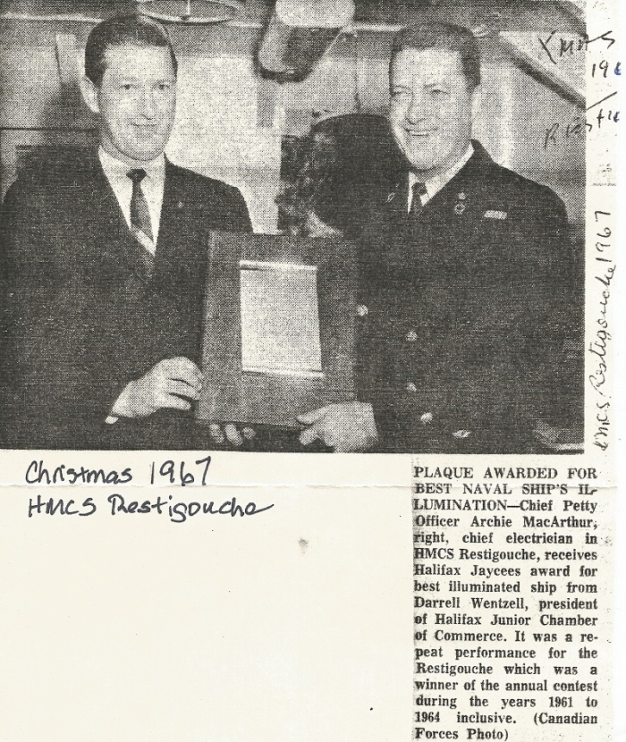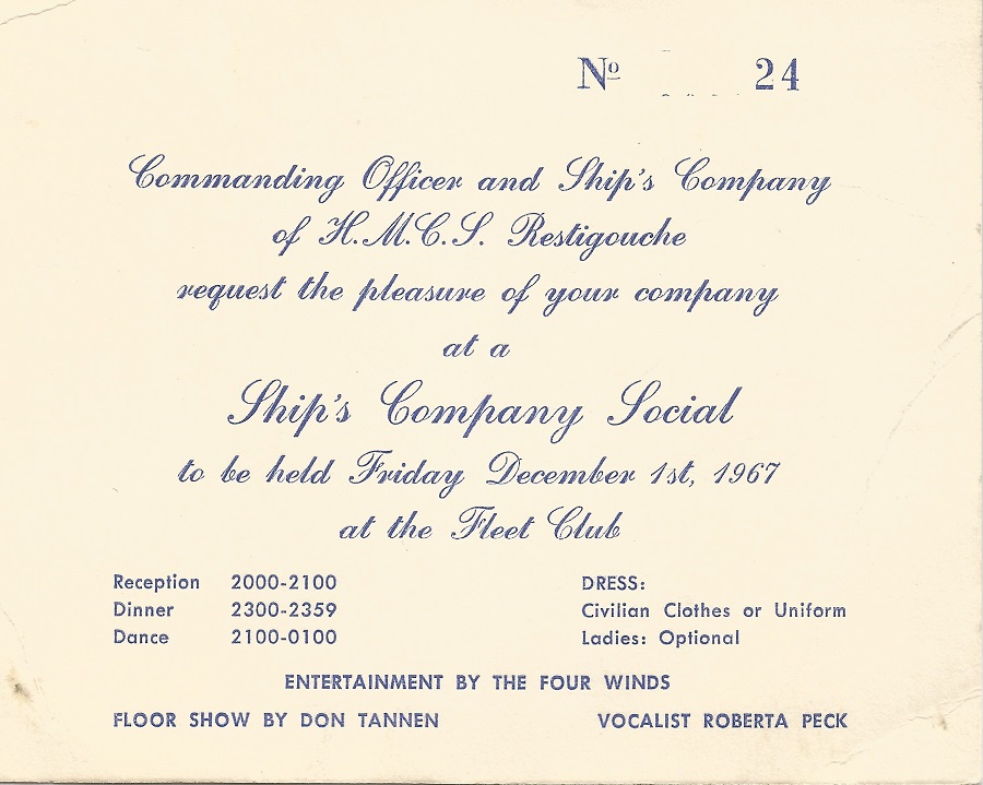 (AM154) Family Day cruise - Aug 1966 - HMCS SKEENA seen from HMCS RESTIGOUCHE (AM155) Demonstration of rescue by helo - Family Day cruise - Aug 1966 (AM166) Sea King Helo - Family Day Cruise - Aug 1966 (AM167) Invitation to Ship's Company Dance 01 Dec 1967 (AM168) Chief MacArthur, Chief ET on HMCS Restigouche, receives the award for the best illuminated ship, Christmas 1967