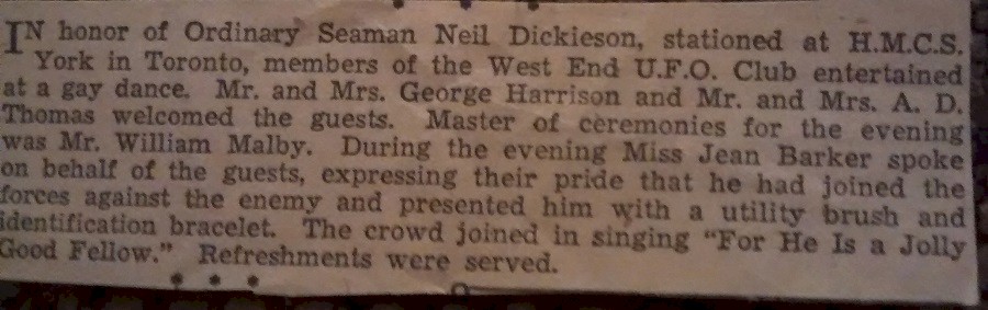 (JD01) Portrait of Seaman Dickieson (JD02) Seaman Neil Dickieson (left) with friend (JD03) Seaman Dickieson (right) with friends (JD04) Newspaper article on a dance where OS Neil Dickieson was honoured