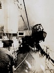 (WM49) "M.O. going aboard a corvette from our ship. Depth charge broke loose and rolled around and broke a mans arm when he tried to secure it. (Mid Ocean)" Note: Wm. McComb is 3rd from the left in sea boat. Just a wee bit taller than the rest. (WM50-WM51) "Bringing an injured man from corvette in the background aboard our ship for treatment after the hurricane. (I think.)" (WM52) Sea boat returning to HMCS EASTVIEW - "Capt. of this ship went mad 6 days out of Derry. We sent a boarding party over and put the mate in charge and put the Capt. in a straight jacket, some fun. He was a bit violent." (WM53) Sunset at sea - can you see the convoy on the horizon (WM54) Sunset at sea