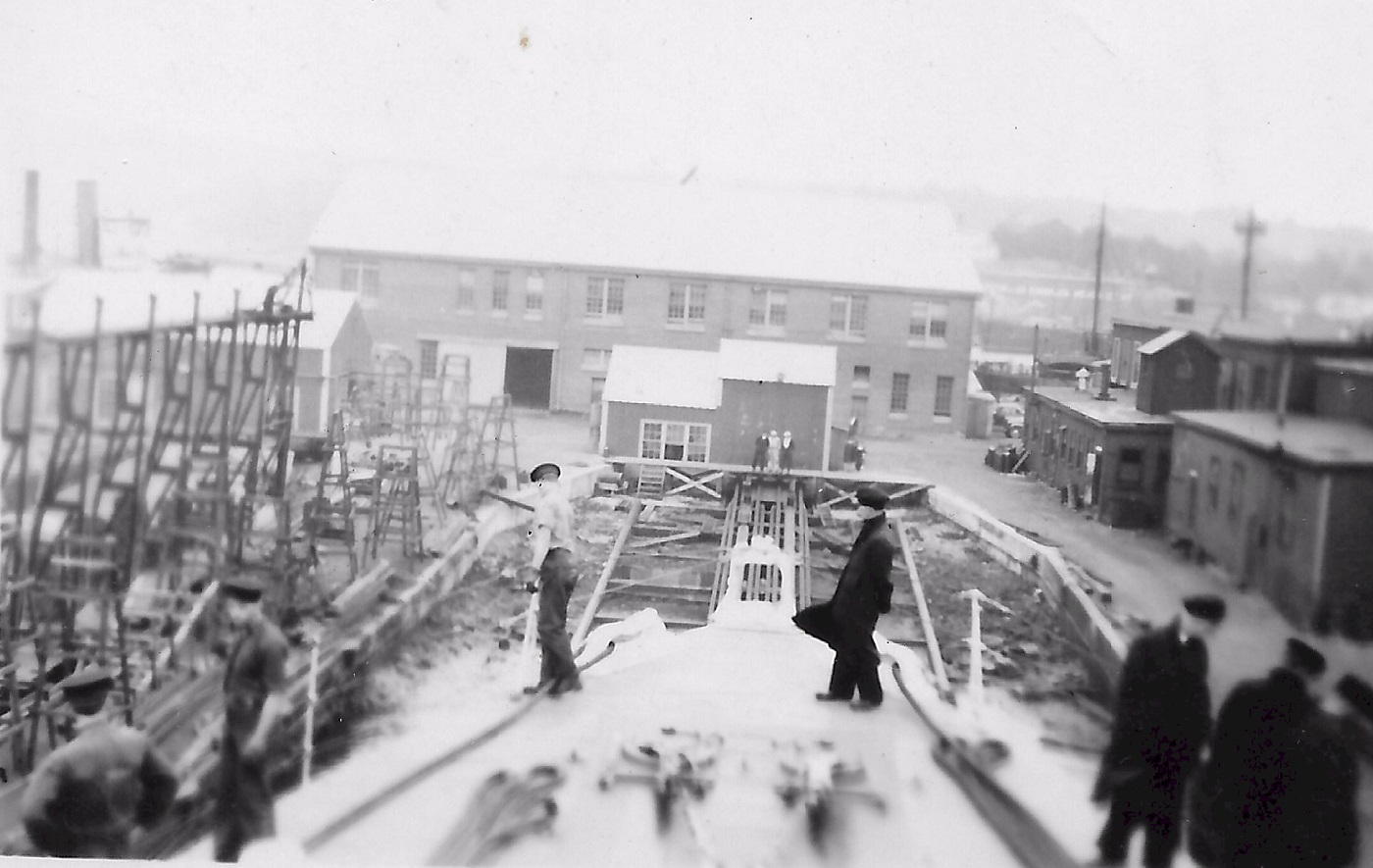 (WM67) HMCS JOLIETTE aground near Moville, Lough Foyle - 22 Oct 1944 (WM68-WM71) Damage to JOLIETTE being repaired in dry dock, Belfast, Northern Ireland from 05 Dec 1944 - 05 Apr 1945 (WM72) Looking up at JOLIETTE's bow from the dry dock (WM73) Members of JOLIETTE's around the ship's screw while she is in dry dock in Londonderry. "See our mascot? Curly has her in his arms. She died at sea and was buried off the coast of Laine"