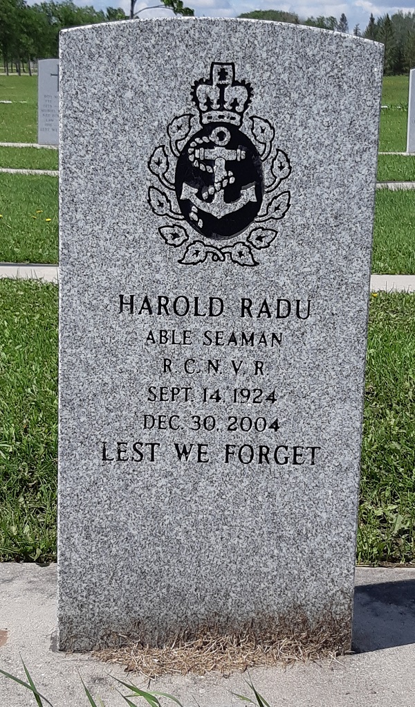 RADU, Harold - Peacefully, on December 30, 2004, after a brief illness, Harold Radu, our beloved husband, father and grandfather, passed away at the age of 80 years at the Concordia Hospital, with his wife Irene by his side. Besides his wife, Harold is survived by his two daughters, Dianna (Don) and grandson Michael, Brenda (Ross) and grandsons, Jason and Ryan; two sisters, Isabel Youck of Regina and Doreen Bjornson of Edmonton. Harold was born on September 14, 1924, in Regina, SK. Prior to his brief illness he resided at River East Personal Care Home (his home away from home). The staff were like family to him, and he enjoyed many happy times there. Many thanks to the caring staff on E Wing. Funeral service to be held on Wednesday, January 5, 2005, at 11:00 a.m. at the Transcona Funeral Chapel, 1800 Day St., with Pastor Larry Ulrich officiating. Interment to follow in the Field of Honor, Transcona Cemetery. Flowers gratefully declined. Donations may be made to Alzheimers Society or a charity of your choice. Dad, the struggle of life is over, and you now can rest in peace. Transcona Funeral Chapel in care of arrangements. (Winnipeg Free Press 04 Jan 2005)