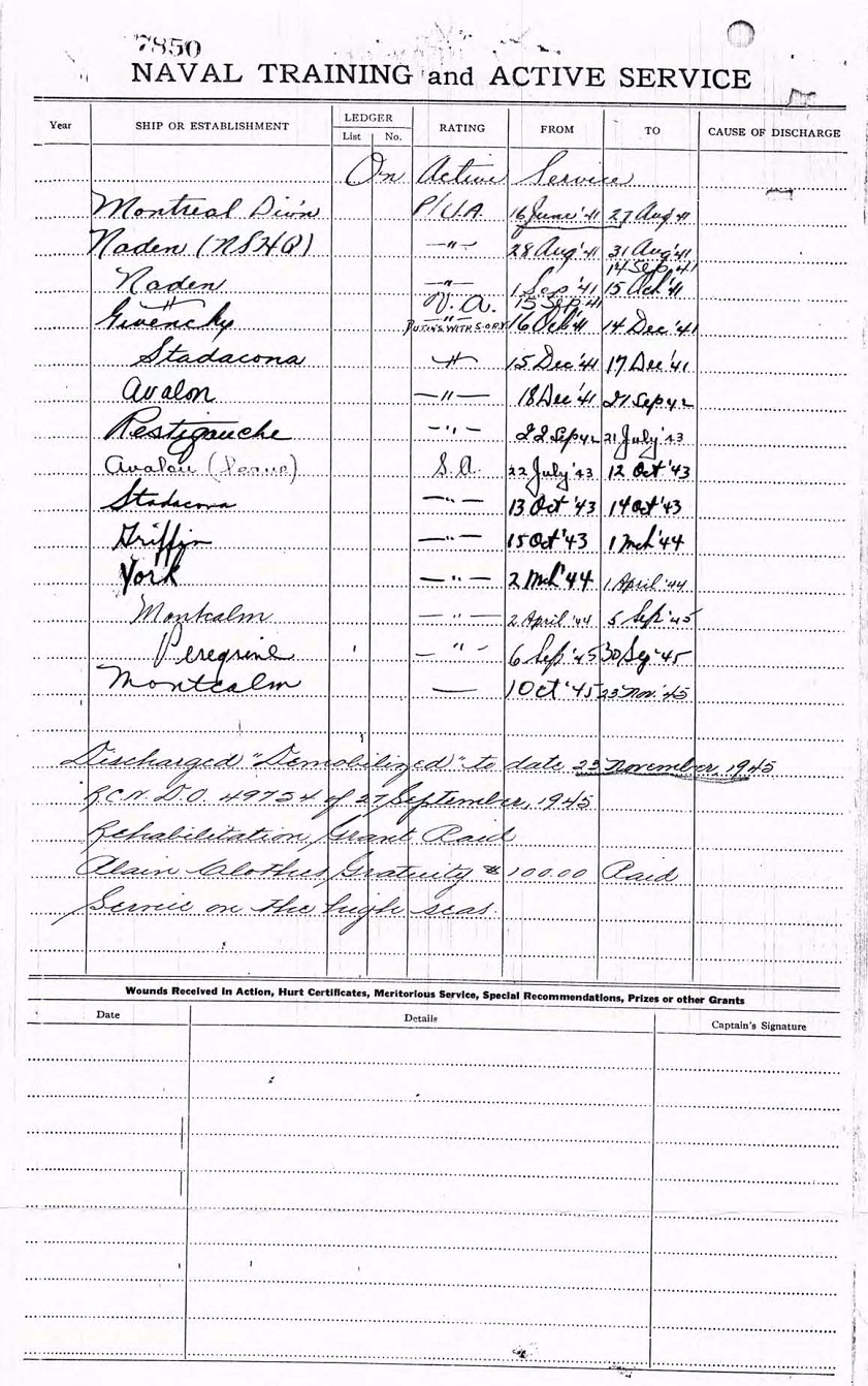 Ships served in: MONTREAL DIVISION RCNVR - Commenced active service 16 Jun 1941 HMCS GIVENCHY (for duty with S.OR.Y.) 16 Oct 1941 - 14 Dec 1941 HMCS RESTIGOUCHE - Served in RESTIGOUCHE as a SA 23 Sep 1942 - 21 Jul 1943 HMCS GRIFFIN - Served in GRIFFIN 15 Oct 1943 - 01 Mar 1944 HMCS YORK - Served in YORK 02 Mar 1944 - 1 Apr 1944 HMCS MONTCALM - Served in MONTCALM 02 Apr 1944 - 05 Sep 1945 HMCS MONTCALM - Served in MONTCALM 10 Oct 1945 - 23 Nov 1945. Demobilized 23 Nov 1945