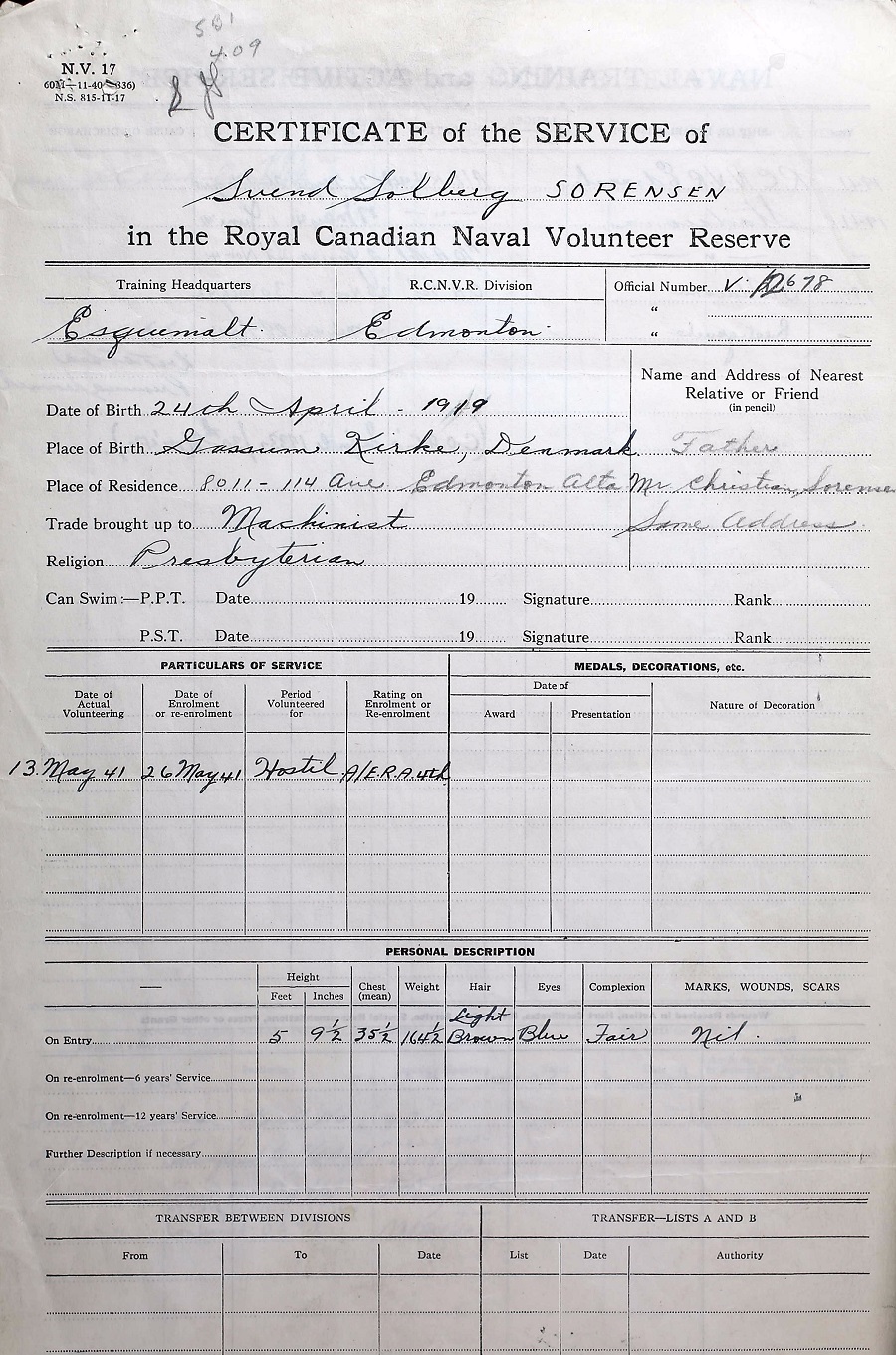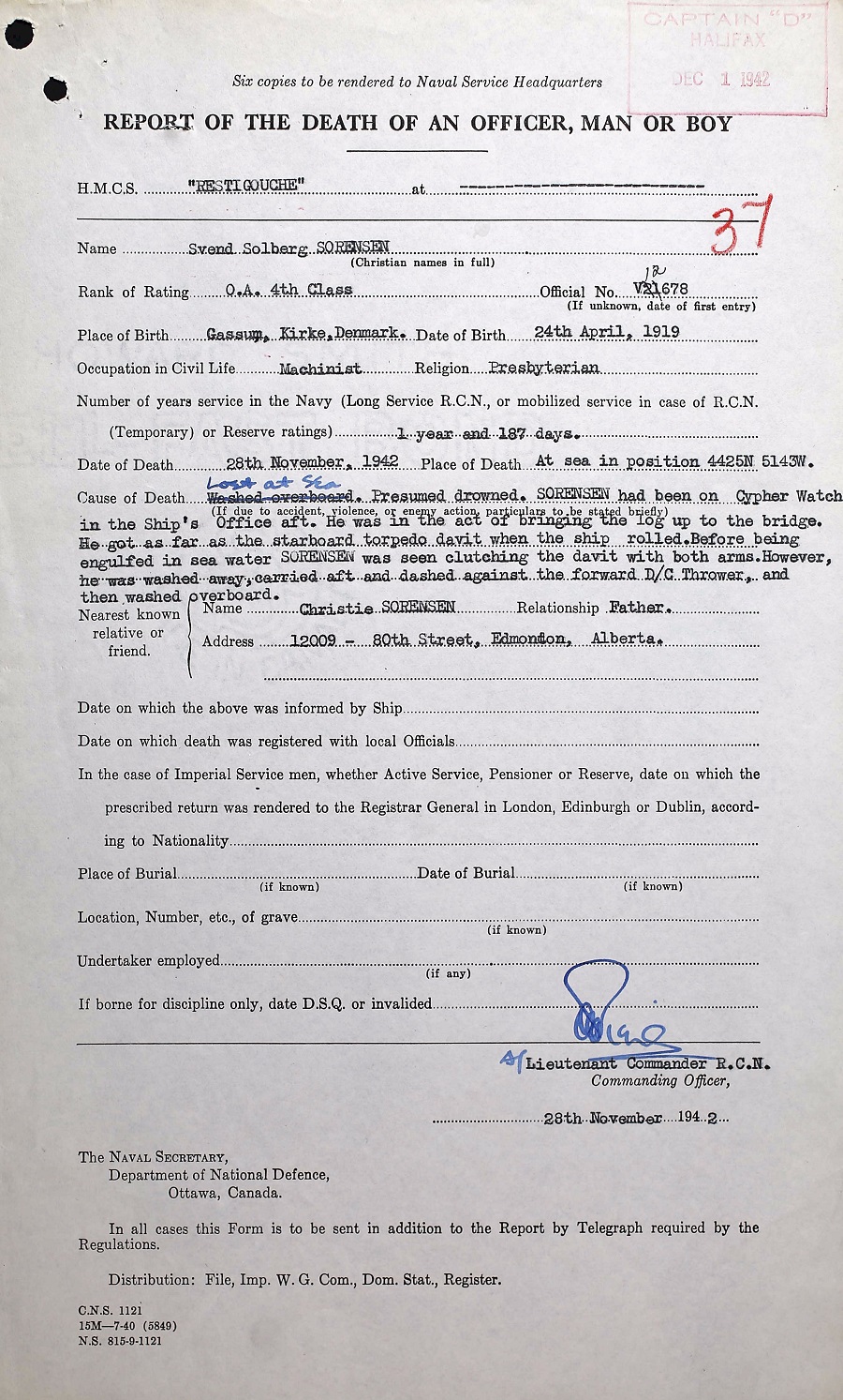 SORENSEN, Svend Solberg, Ordnance Artificer 4th Class, V12678, RCNVR, MPK - 28 Nov 1942, HMCS RESTIGOUCHE - son of Christie and Agnes Solberg Sorensen, Edmonton, AB. He was a machinist before enlisting and was born in Gassum, Kirke, Denmark.