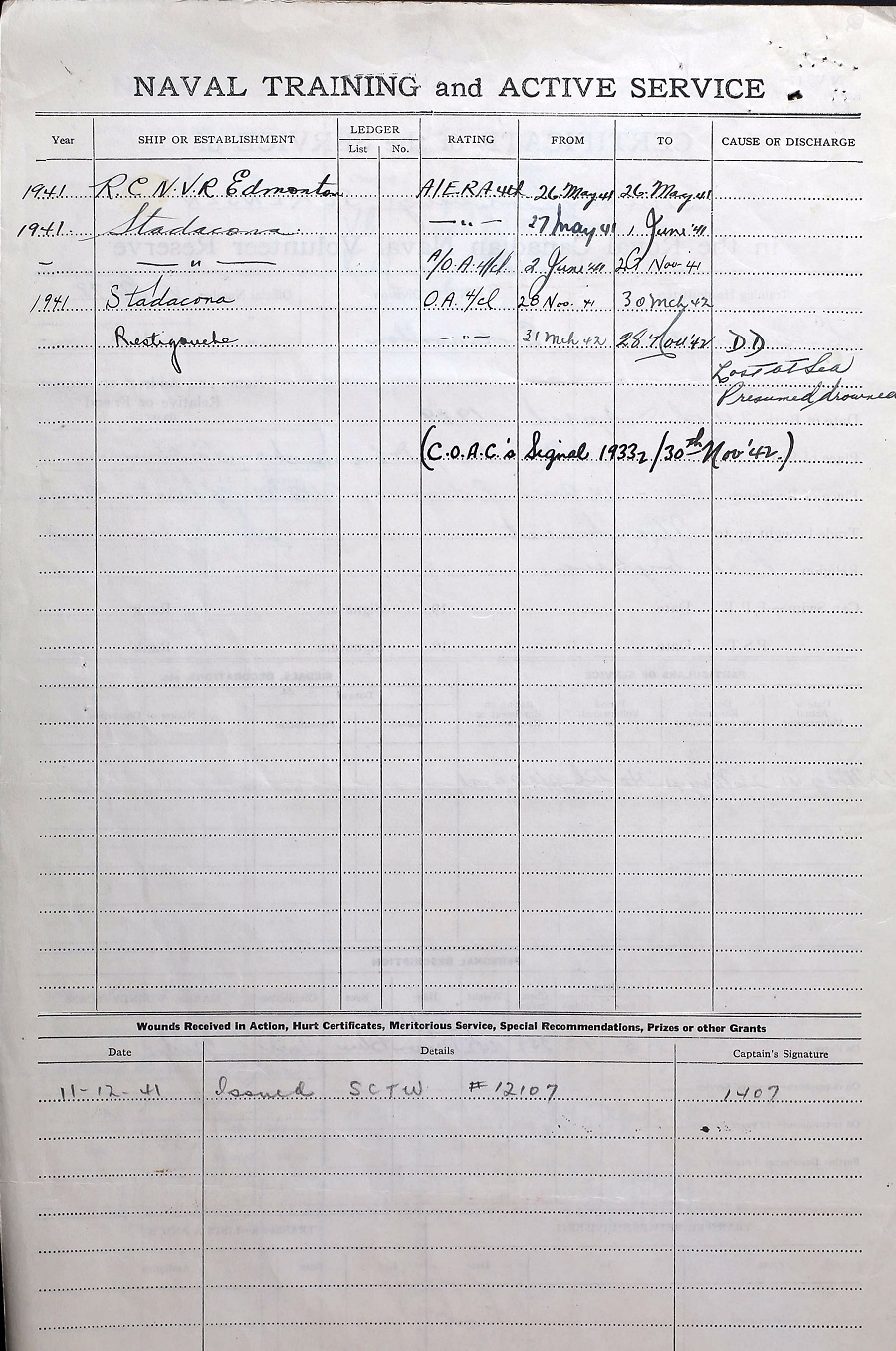 Ships served in: RCNVR DIVISION EDMONTON - Enlisted 13 May 1941. Commenced active service 26 May 1941