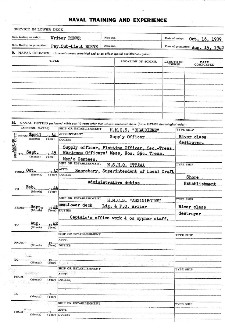 Ships served in: HMCS ASSINIBOINE - Served in Assiniboine - Sep 1941 - Aug 1942 as a L/Writer and PO Writer, RCNVR HMCS CORNWALLIS - Appointed to Cornwallis 14 Sep 1942 as a Prob. Pay SLt, RCNVR, For Disposal or Under Training (Navy List Sep 1942) (Seniority 15 Aug 1942 (Navy List Mar 1943) NSHQ OTTAWA - Appointed to NSHQ Ottawa, as Staff of Superintendent Local Craft Section, 14 Jun 1943 as a Paym/Lt, RCNVR (Navy List Aug 1943) RCN BARRACKS HALIFAX - Appointed to RCN Barracks Halifax 02 Mar 1944 as a Paym/Lt, RCNVR, For Disposal or Under Training (Navy List Feb 1944) HMCS CHAUDIERE - Appointed to Chaudiere H99 on 10 Apr 1944 as Paym/Lt, RCNVR. Served in Chaudiere 10 Apr 1944 - Sep 1945 * Retired List - as a Lt (S), RCN(R) (seniority 15 Aug 1942) (Navy List Jul 1946) HMCS DONNACONA (Retired List) - As a LCdr (S), RCN(R) (seniority 15 Aug 1950) (Navy List Jul 1952). Last noted in the Navy Lists at HMCS Donnacona on the retired list as a LCdr (S), RCN(R)