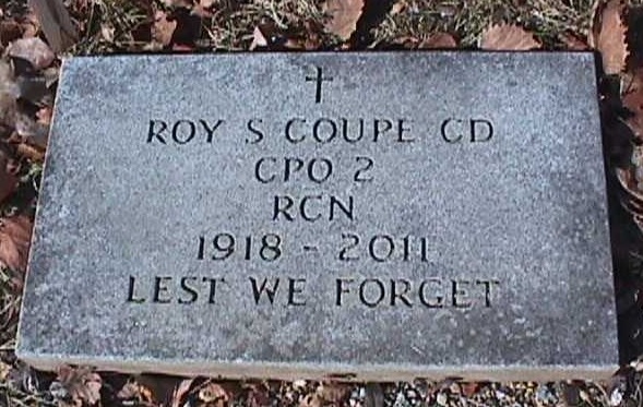 COUPE, Roy Stewart - 92. it is with great sadness that we announce his passing on Tuesday, April 12, 2011, in the QEII Health Sciences Centre. Born in Halifax on October 2, 1918, he was the son of the late Lillian Fredericks. He was a proud member of the Royal Canadian Navy from 1939-1966. He served in both the Second World War and the Korean War. He retired from the service holding the rank of Chief Petty Officer and was a lifetime member of the Chief's and PO's Association. He enjoyed many Fridays playing bridge with the boys. He and his loving wife Marian attended many a New Year's Eve party, as well as numerous social events at the Windsor Park Mess. In 2010, he was very proud to have his family around him as he was honoured to lay a wreath in memory of the sinking of the HMCS Weyburn on which he served. The ceremony was held at the Peregrine Club as part of the RCN's 100-year anniversary. He was predeceased by sisters, Kathleen, Verna and Gladys. He is survived by his loving wife of 65 years, Marian (Handley). Also survived by the apple of his eye, his loving daughter, Donna (Lawlor); son-inlaw, Stephen; and grandchildren, Stephen (Claudia) and Christopher (Tammy). He was also very grateful to have been blessed with great-grandchildren, Ryan and Katie. Burial will take place in St. George's Cemetery, Head of St. Margaret's Bay.