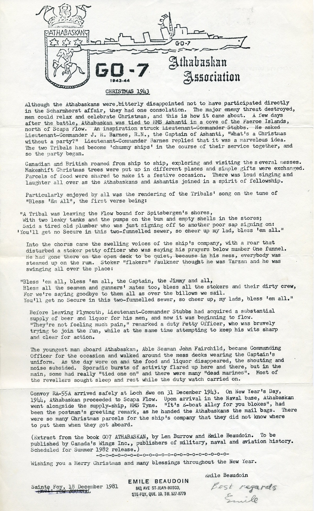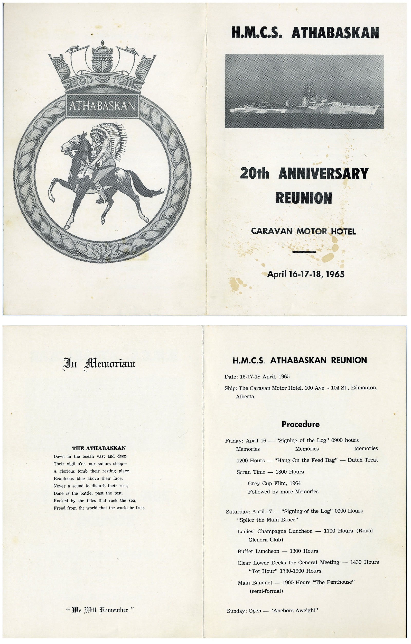 (WT60) Russian Jubilee Medal “Forty Years of Victory in the Great Patriotic War 1941–1945” - Presented to William D. Trickett from USSR Ambassador to Canada Aleksei Alekseievich Rodionov on October 1, 1988. (WT61) Pamphlet for the 20th anniversary reunion for the crew of HMCS ATHABASKAN G07 (WT62) ATHABASKAN Association news letter from Emile Beaudoin - 18 Dec 1981