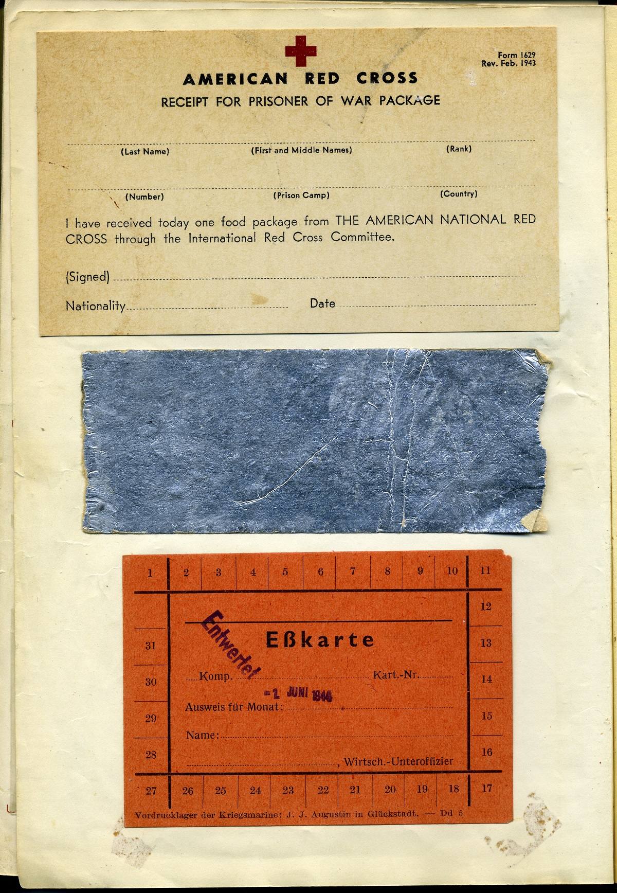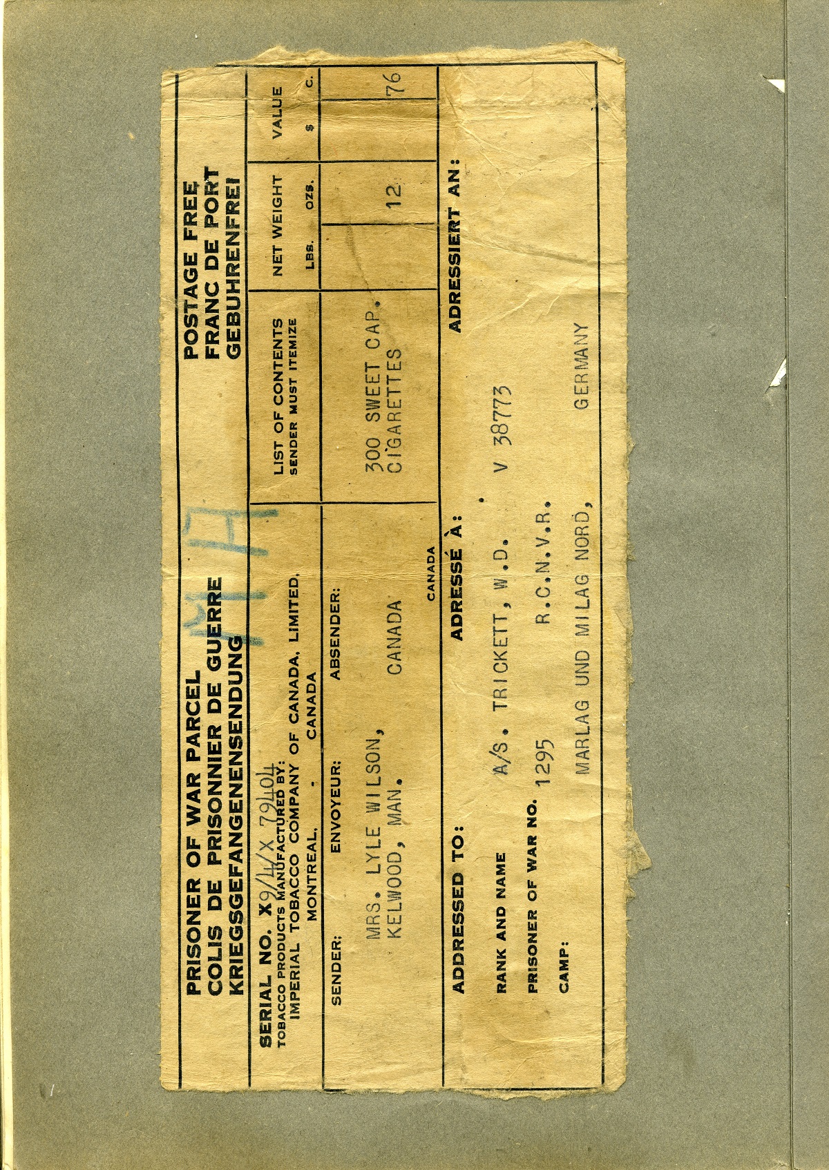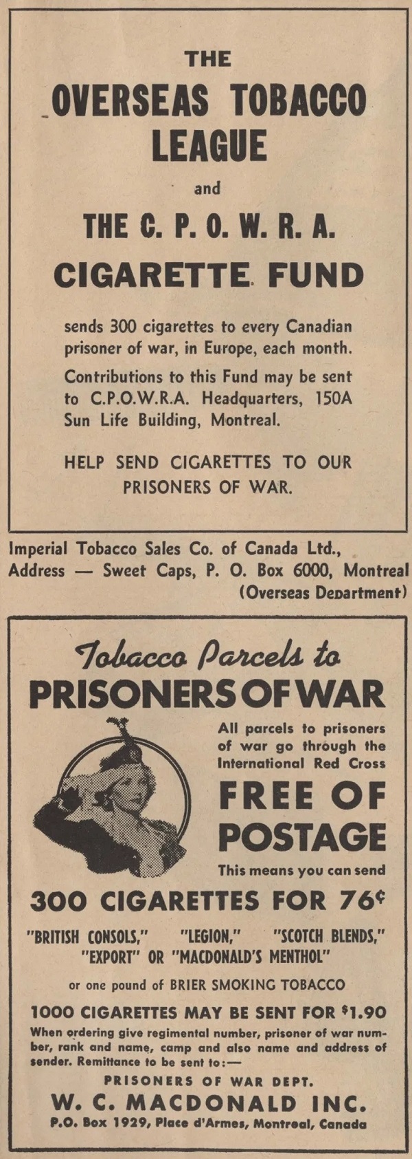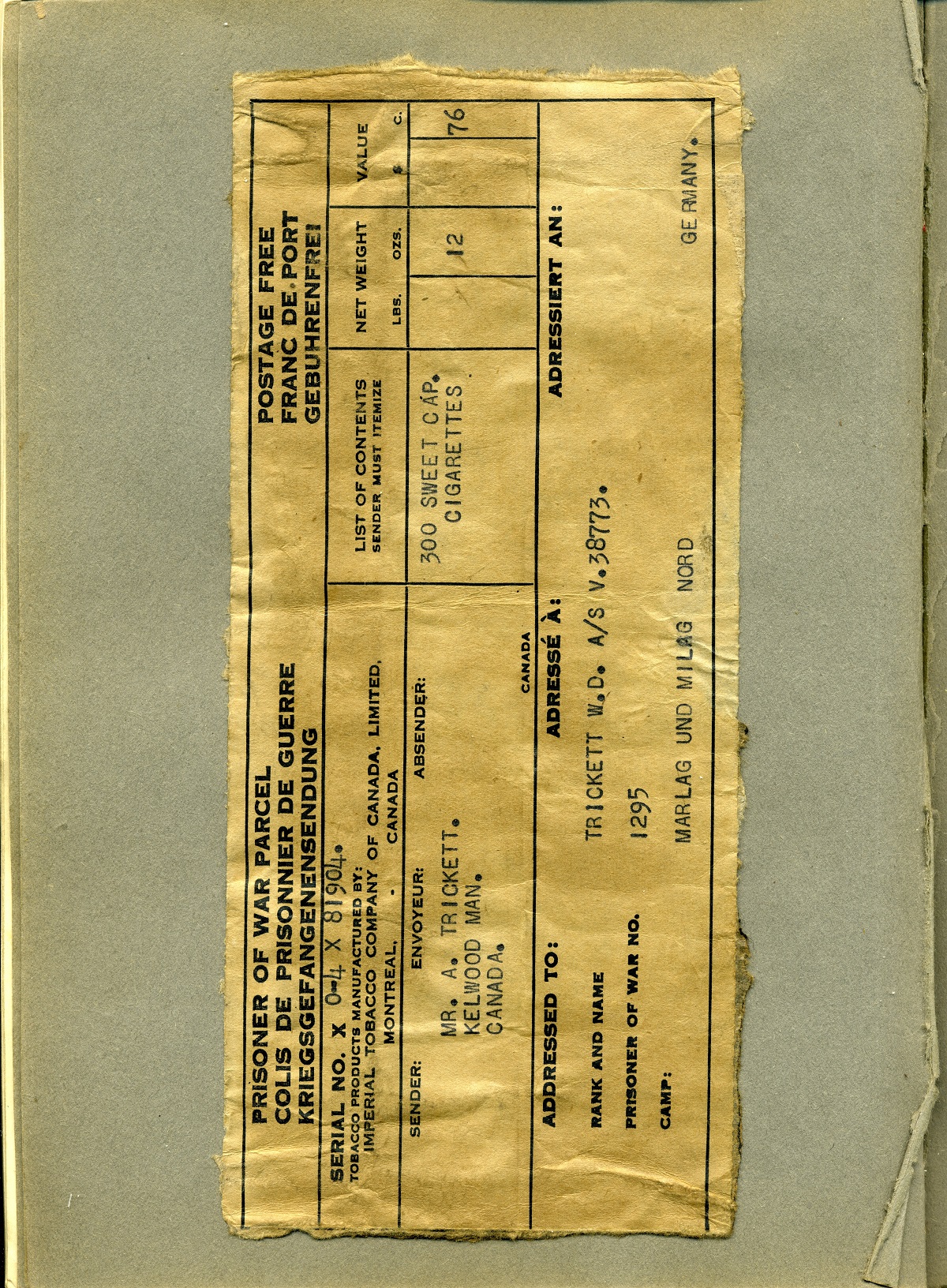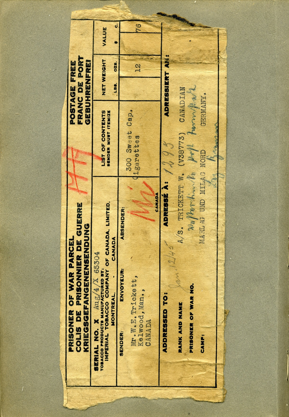 (WT43-WT45) Almost more important than food was the demand for cigarettes requested by and shipped to the Canadian POWs. Letters to home contained pleas to send more cigarettes. Their true purpose was not necessarily for Canadian consumption but for bartering with the German guards for extra necessities. German tobacco was of inferior quality and Canadian cigarettes were used in trade. Relatives of Bill’s took advantage of the ‘300 Cigarettes for 76˘’ and he kept their receipts in his Logbook