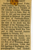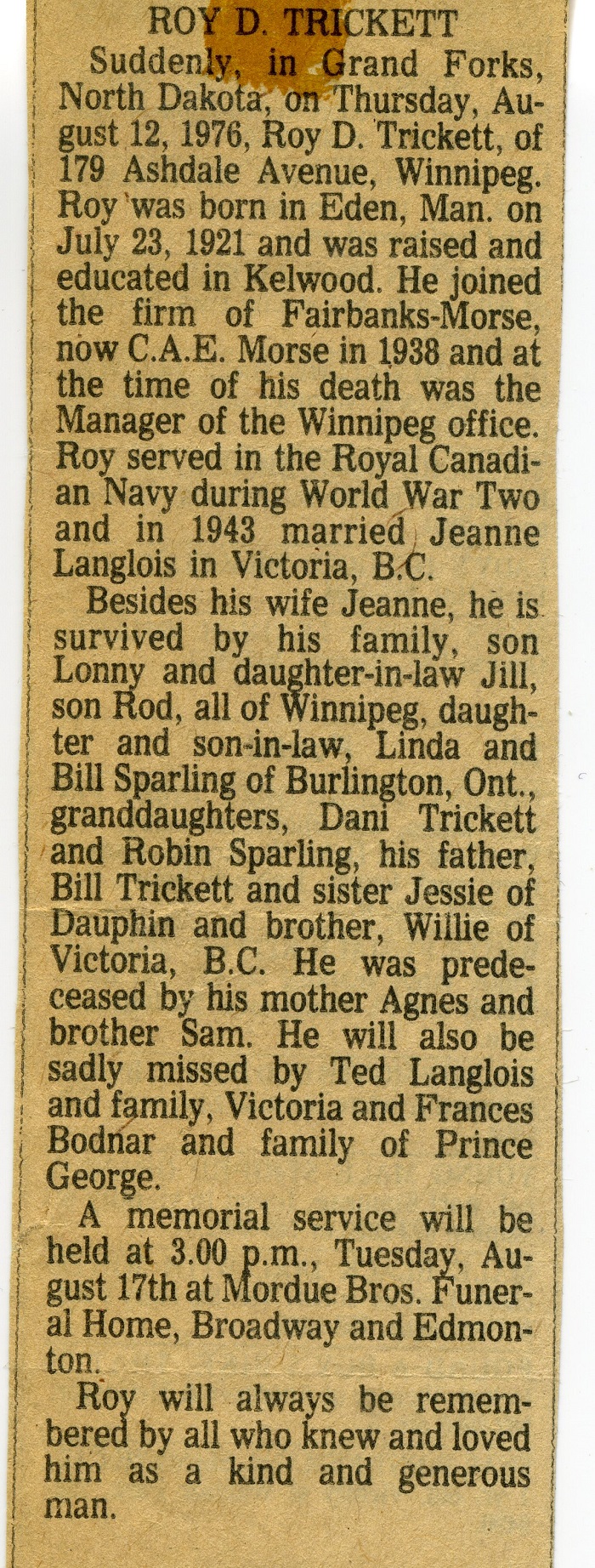 Trickett, William Dearl (Bill) - Like any good Navy ditty, this tale begins in a bar. Little did I know, a visit to the local Legion in my home village of Kelwood, MB would end up as a quest to uncover some of my own ATHABASKAN family history. While