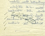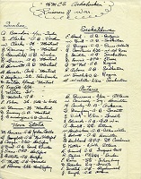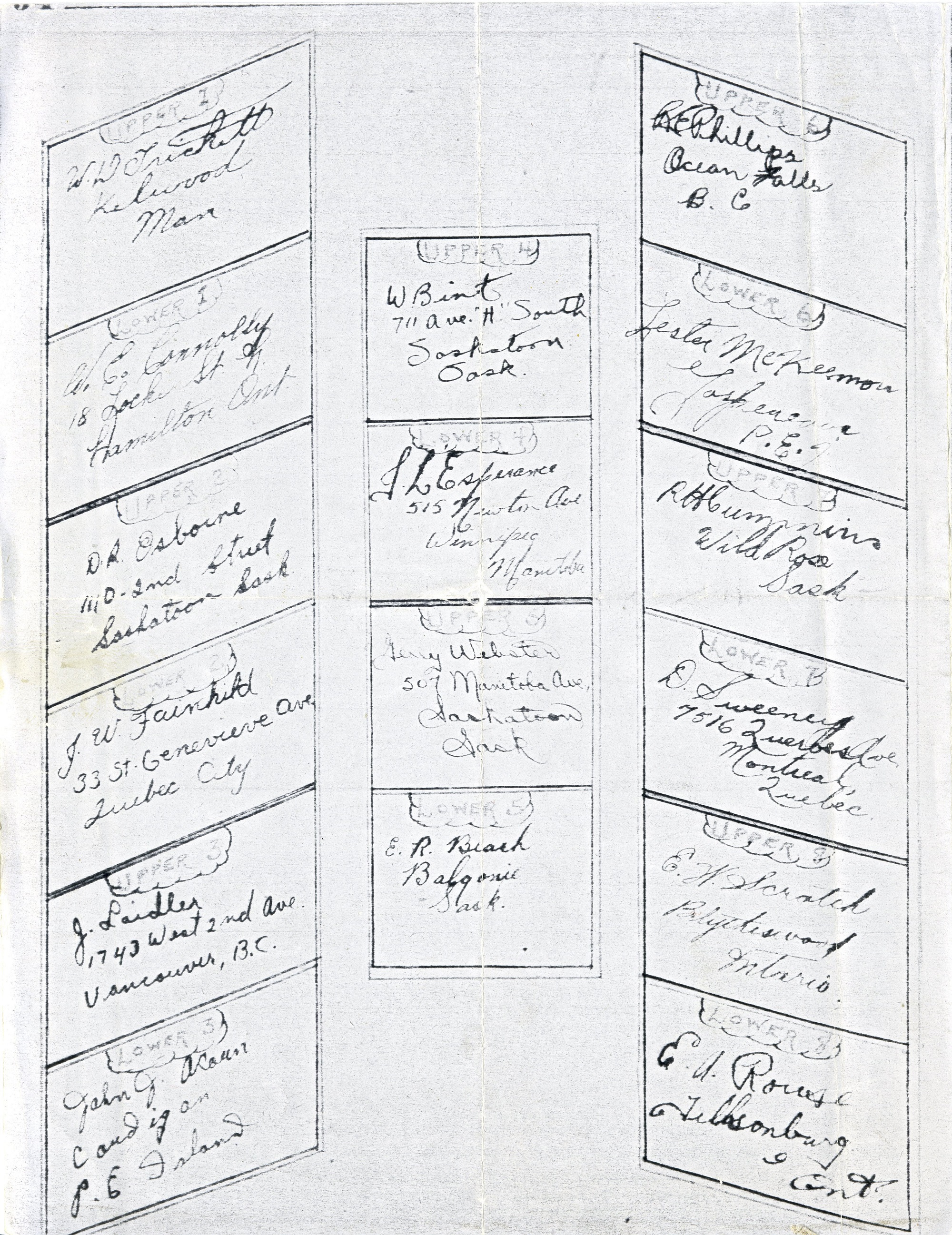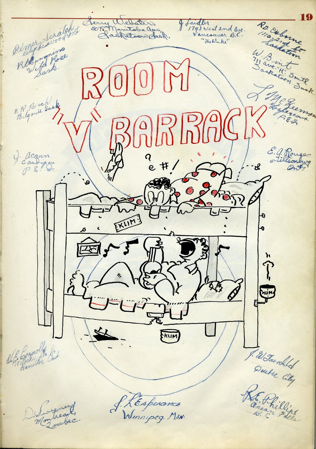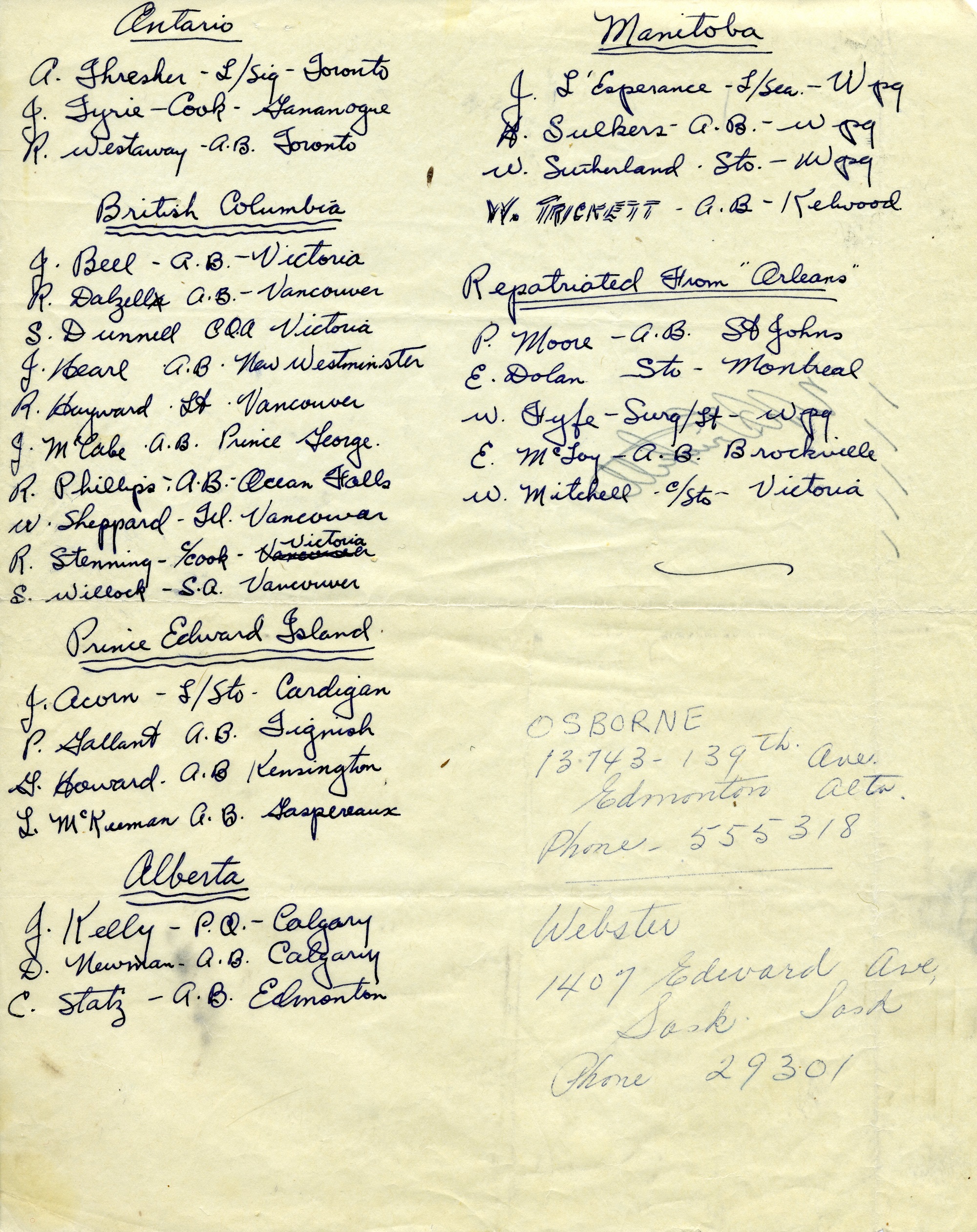 (WT57) Names and addresses of those in V Barracks - W. D. Trickett, Kelwood, MB; Elmer Scratch, Blythewood, ON; Gerry Webster, 507 Manitoba Ave, Saskatoon, SK; J. Laidler, 1743 West 2nd Ave., Vancouver BC; “The Duke” R. D. Osborne, 1110-2nd St, Saskatoon, SK; W. Bint, 711 Ave. “H”. South, Saskatoon, SK; Lester McKeeman, Gaspereaux, PEI; E. A. Rouse, Tillsonburg, ON; J. W. Fairchild, 33 St. Genevieve Ave, Quebec City; R. E. Phillips, Ocean Falls, BC; J. L’Esperance, 515 Newton Ave., Winnipeg, MB; D. Sweeney,7516 Querbes Ave, Montreal, QC; W. E. Connolly, 18 Locke St. N. Hamilton, ON; J. Acorn, Cardigan, PEI; E. R. Beach, Balgonie, SS; R. H. Cummins, Wild Rose, SK