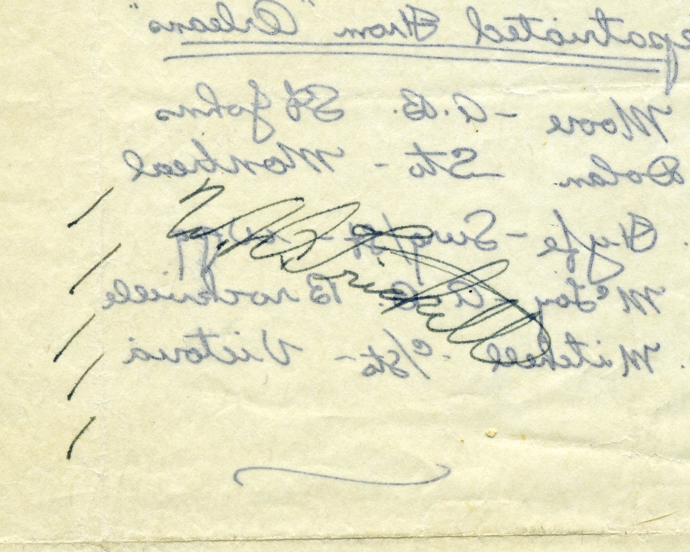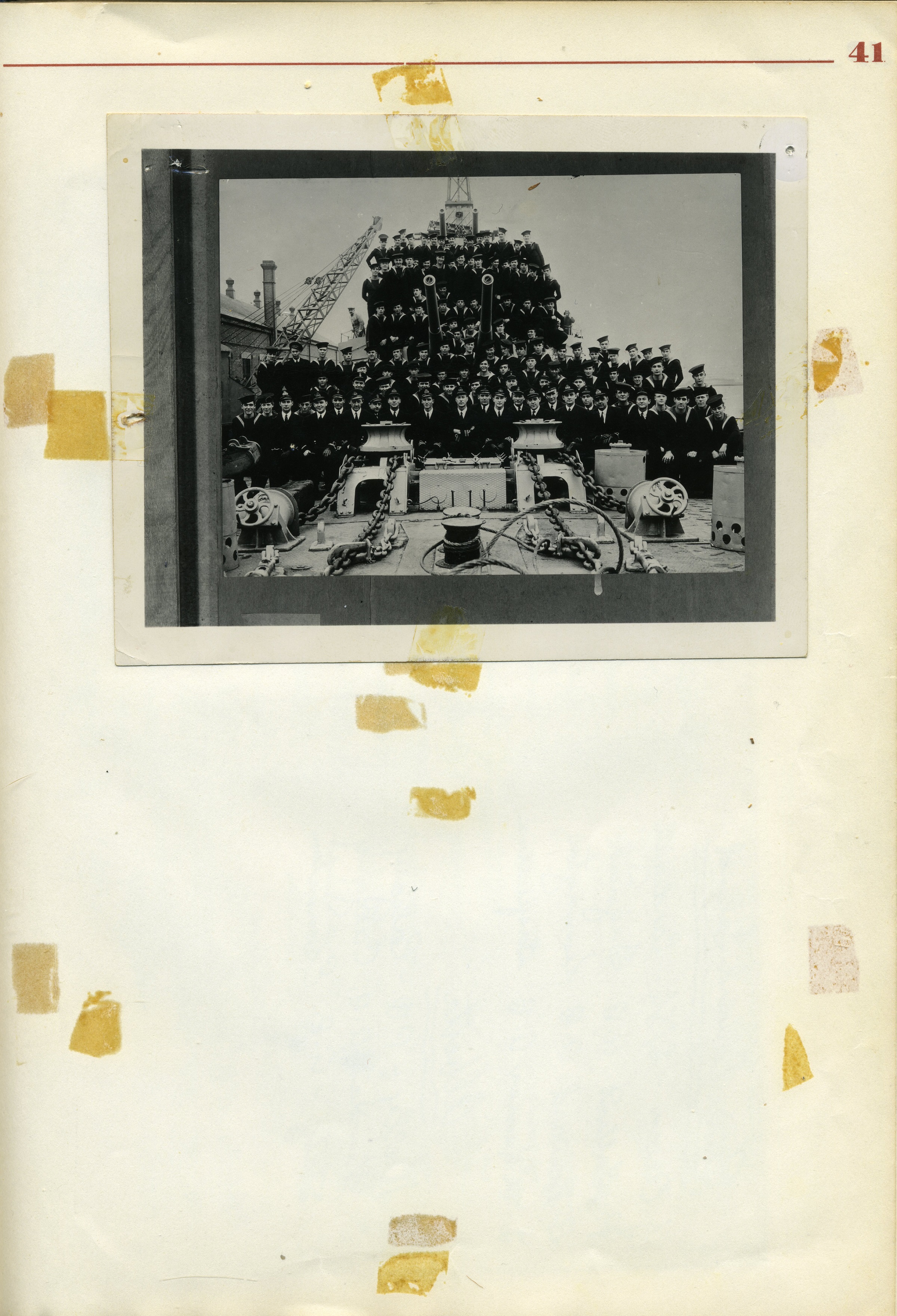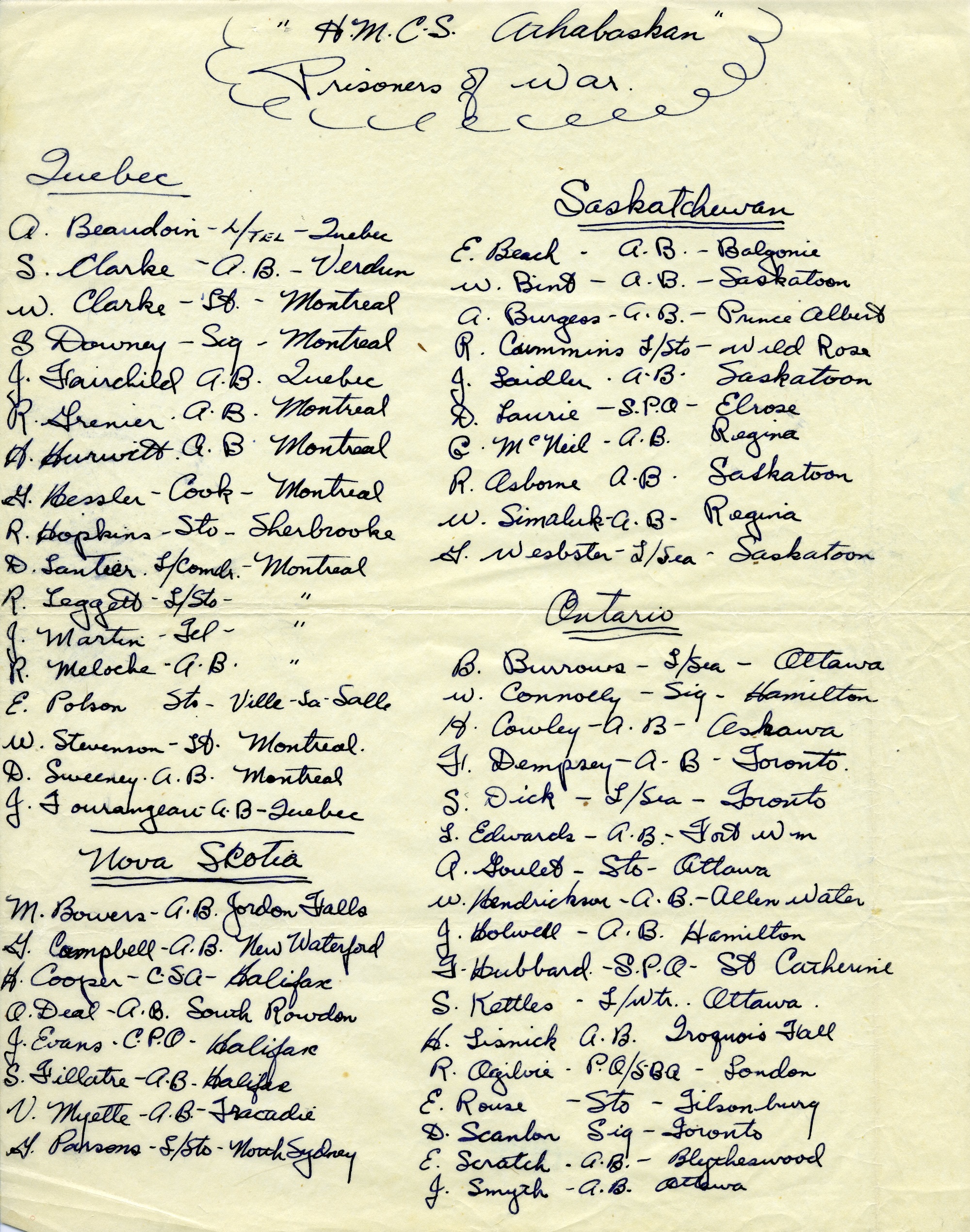 (WT22) Last crew photo of HMCS ATHABASKAN G07 (WT23-WT24) List of ATHABASKAN POWs (WT25) Bill Trickett's signature on back of POW list.