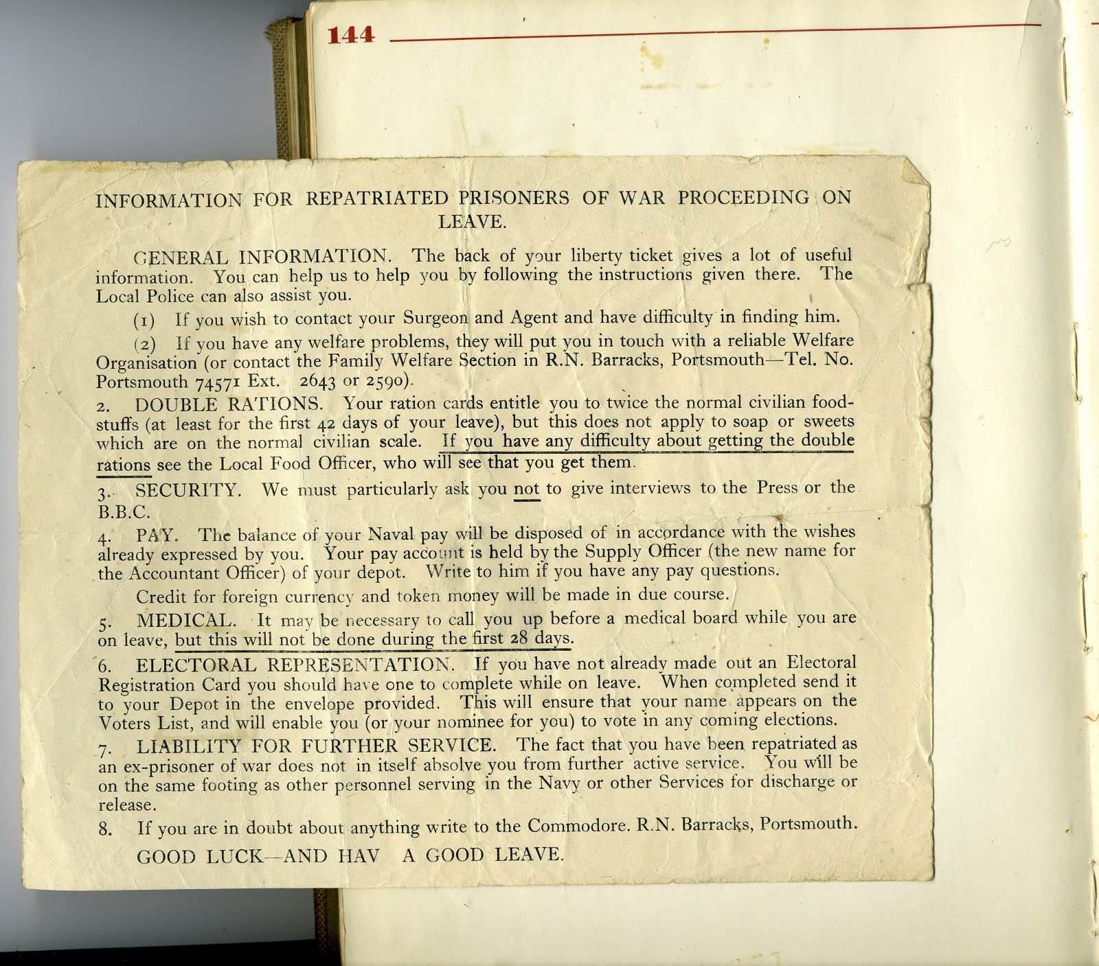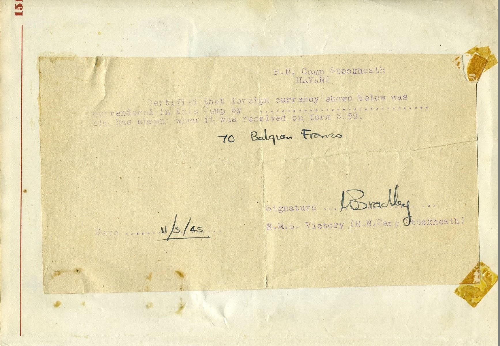 (WT53) Stockheath Naval Camp located in Portsmouth, England would have been a stopover point for the returning ATHABASKAN POWs after they were liberated. Dated May 11, 1945, Uncle Willie would have exchanged some Belgian Francs for British Pounds. (WT55_ Ted, Mack and Bill (AB William Trickett) (WT56) Larger image of photo in WT55