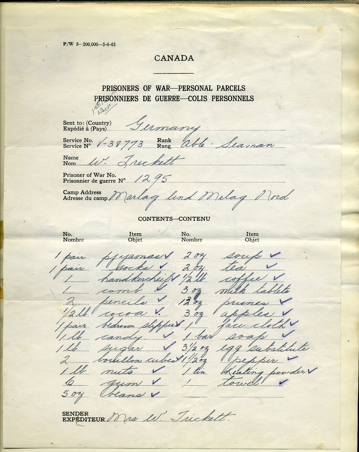 (1st Class), V38773 had served onboard HMCS ATHABASKAN G07! As a previous bridge officer and Public Affairs Representative for HMCS ATHABASKAN 282 for two years, I was already intimately acquainted with the history and sinking of the original ship. The RCN regularly conducts Remembrance ceremonies near the site of the sinking each time a ship is near that particular stretch of French territorial waters. In fact, in 2015 while on a NATO deployment to the Mediterranean, my ATHABASKAN conducted a ceremony over that lonely patch of the English Channel. I was unaware that 70 years previously, my young Uncle, oil-soaked and hypothermic, was desperately clinging to life at that very spot. In a twist of fate, AB Trickett's destiny lay with being rescued by the German torpedo boat T24. There have been numerous writings describing the exploits and disposition of the ill-fated ATHABASKAN G07 and her crew. After poring anew through my copies, I found Uncle Willie's name listed in the crew manifest. Also, he appeared in many of the old photos as an unidentified sailor. There are several pictures of him and his monster grin front and center in group photos. In one, he is clearly seen seated in the back of a truck flanked by German soldiers after being brought ashore at Brest, France. In another, he is lined up with his Barrack 'V' messmates in the POW camp Marlag und Milag Nord, near Bremen, Germany. Luckily, he did not appear to have suffered any severe injuries from the torpedo blasts, the resulting explosions and fire, or his hours of floating in the oily debris of his sunken ship. Unfortunately, he and 82 other ATHABASKANs spent the rest of the war locked up as German POWs. But other than a few tantalizing tidbits of specific information, Willie Trickett's military story might have easily gone to his grave when he passed away in Victoria, BC, December 14, 2004 at the age of 79. Considering the trauma of shipmates dying all around him in the water, the hardships of POW life, and some friendly fire tragedies leading up to his liberation in May 1945, it was no wonder that he never really spoke of his experiences. Of course, complicating matters as I continued to dig, most of his military memorabilia had been liquidated and was scattered who knows where. But I turned up an old Ebay ad for his Y.M.C.A. Wartime Log (POW No. 1295 of Marlag und Milag Nord, Germany). After a lot of sleuthing, I tracked the logbook down to a military collector in California who graciously sold it back to me. The Canadian Y.M.C.A. in December 1944 gave every Canadian POW a Wartime Log so that they could keep a diary of their experiences. Although Uncle Willie's logbook did not have much in the way of personal writings, it did contain much of the flotsam and jetsam that a Navy sailor collects during their travels. Many of Willie's friends drew intricate drawings and cartoons in the pages of his logbook. There are old photos of G07, the POW camp, and fellow sailors. He had a receipt from his mother, Mrs. W. (Agnes) Trickett, listing the contents of a POW parcel. Daily camp rations were basically a chunk of bread and a potato. Red Cross parcels and food mailed from relatives saved the POW's lives. There were also receipts for cartons of 300 Sweet Caporal cigarettes from Mr. W.E. (Bill) Trickett (his father who was Kelwood's United Grain Growers Elevator agent), Mr. A. (Alex) Trickett (a brother), and Mrs. Lyle Wilson of Kelwood. Cigarettes were too valuable in camp to all be smoked and were traded with the German guards for food and material. In letters to home, prisoners would often ask for the prized Canadian commodity as German cigarettes were rather inferior. Aid groups and support from the home front made the tedium and privations of life behind barbed wire tolerable. Also, to my surprise, William D. Trickett had been presented the Soviet Union's Jubilee Medal "Forty Years of Victory in the Great Patriotic War 1941-1945" from the USSR Ambassador to Canada, Aleksei Alekseievich Rodionov on October 1, 1988. Known as the Murmansk Medal, only a small handful of non-Russians have ever received this honour. The RCN, USN and Royal Navy convoy runs up to the high Arctic region of Russia from 1941 to 1945 kept the country in the war and provided the critical eastern front that divided Hitler's forces. Willie Trickett and my great aunt Jean moved back to Kelwood for a short time after his return from the war, then moved to Victoria, BC where he worked as a city bus driver. They had a daughter, Sandra (deceased) and a son, Sam. After retirement, they bought and renovated Jean's mother's old house in Kelwood and used it as a summer vacation home. Willie rarely spoke of his wartime experience except for a few anecdotes after having one too many with his Legion buddies. At some point a bullet had whizzed by his ear. Also when they were onboard T24, he spoke of a German officer with a sword who cut all their soaked and fouled uniforms off. Willie did keep a room in his Kelwood home with much of his ATHABASKAN G07 memorabilia plus the local Legion now has more memories of the old ship up on the walls. Unfortunately, all of Willie's ditties died upon his passing. Hopefully, he and all of the former ATHABASKANs are all somewhere hoisting large tots of rum and sharing good times.