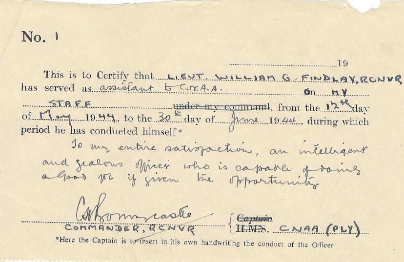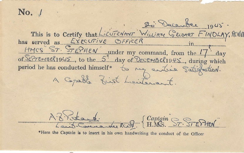 Ships served in: HMCS KINGS - Appointed to Kings 26 Mar 1942 as a Prob. SLt, RCNVR (Navy List Apr 1942) HMCS CORNWALLIS - Appointed to Cornwallis 20 Jul 1942 as a SLt, RCNVR (seniority 16 Mar 1943) for A/S Maintenance Course (Navy List Sep 1942) HMCS GUYSBOROUGH - Appointed to Guysborough Jan 1943 as a SLt, RCNVR. Re-Appointed to Guysborough 22 Jul 1943 as a Lt, RCNVR (seniority 16 Mar 1943) (Navy List Aug 1943). Seniority backed to 16 Mar 1942 (Navy List Feb 1944) HMCS NIOBE - Appointed to Niobe for Canadian Naval Administrative Authority (CNAA), Plymouth 10 May 1944 as a Lt, RCNVR (Navy List Jul 1944). Served in CNAA Plymouth 12 May 1944 - 30 Jun 1944 (Conduct Report of Lt Findlay) HMCS NIOBE - Appointed to Niobe as Lt, RCNVR, For Disposal (Navy List Sep 1944). Appointed to Niobe 21 Jul 1944 as a Lt, RCNVR, For Disposal (Navy List Nov 1944). (Note: Listed in the Navy Lists "for Disposal from Sep 44 to Jan 45) HMCS BOWMANVILLE - Appointed to Bowmanville 19 Jan 1945 as a Lt, RCNVR (Navy List Mar 1945) HMCS AVALON - Appointed to Avalon as a Lt, RCNVR (Navy List May 1945) HMCS ST STEPHEN - Served in St Stephen 17 Sep 1945 - 05 Dec 1945 as Lt, RCNVR, XO (Conduct Report for Lt Findlay). Appointed Commanding Officer 05 Dec 1945 as a Lt, RCNVR. 6th Commanding Officer. Served as CO 05 Dec 1945 - 30 Jan 1946 (Macpherson / Burgess - Ship's of Canada's Naval Forces 1910 - 1981) * Retired List as a Lt, RCN(R) (Navy List Apr 1946) HMCS YORK (Retired List) as a Lt, RCN(R) (Navy List Jul 1952). Last noted in the Navy List for Jan 1960 on the retired list as HMCS YORK as a Lt, RCN(R)