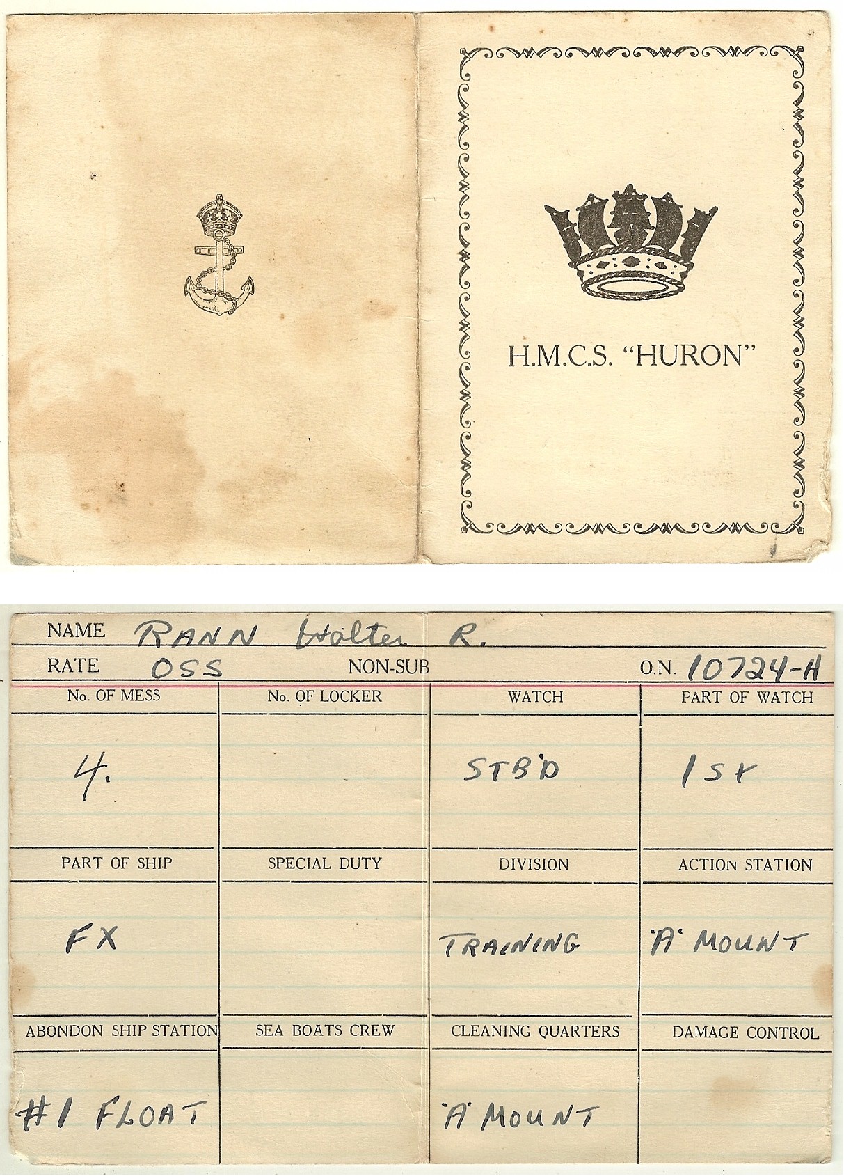 Walter Rann's station card for HMCS HURON Click on the above photo to view a larger image