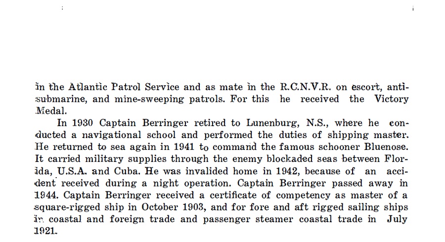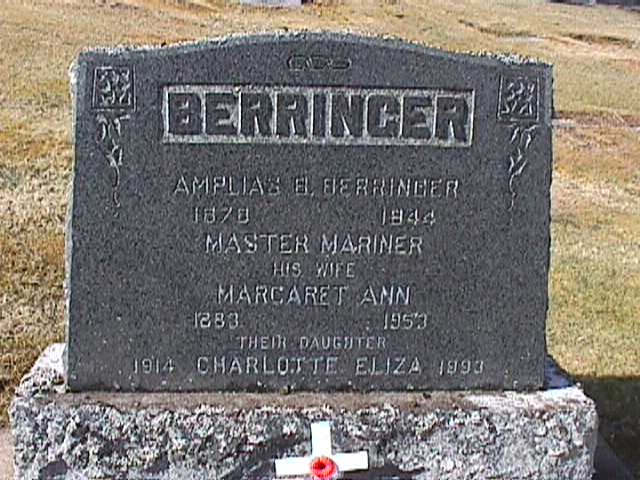 BERRINGER, Amplias - LUNENBURG, May 20 - Following a severe paralytic seizure suffered Tuesday, there passed away at his home a highly esteemed citizen of the community and one of its well known and highly efficient deep sea masters, Captain Amplias Berringer, 66. A Master Mariner of the old school, in which practical experience was more highly regarded than mere nautical book learning, Captain Berringer acquired the greater part of his sea going knowledge in the school of experience; keen in sight and sound judgment, coupled with inventive skill in the face of emergencies, tided Captain Berringer and his craft through many perilous voyages over the seven seas. When quite young he chose sea-going as his vocation, gradually rising to the captain's responsible position, where his ability was quickly recognized. During the First World War Captain Berringer sailed to foreign ports in what is now known as the Merchant Marine services, which placed him in line for the meritorious service medals which he received and which bestowed upon him honorable membership in the Canadian Legion ranks. After retiring from active sea-going he was appointed shipping master for the important port of Lunenburg and surrounding districts, a position capably filled for a number of years. Two years ago, when sea captains were at a premium, Captain Berringer was sought to sail the famous Bluenose, then in Southern waters as a merchantman. Securing official release from the shipping office and placing his daughter Ena, in charge, he flew south for a number of months, skillfully handled the Queen, of the Atlantic from one southern port to another. On one of these trips a fall from the lumber-laden deck resulted in serious back injuries which placed the captain in hospital for many weeks. When fully restored to health he returned to his native town and resumed his duties as shipping master. Besides his widow there survives one son, Major Ormis Berringer, in overseas service; and three daughters; Mildred, Mrs. Alfred Rundle, Halifax; Ena, Mrs. Aubrey Deal and Miss Charlotte, both of Lunenburg. There are also four brothers, Archibald, Morris, Robert and Lieut-Col. G. C. Berringer, all of this town, and two sisters, Beatrice, Mrs. Archibald Geldert, Lunenburg, and Miss Flora Berringer, Halifax. The funeral will take place Monday afternoon from his residence, the service to be conducted by his pastor, Rev. Alexander Allen, St. Andrew's Presbyterian Church, of which the late Captain Berringer was a member. The members of Rising Sun Lodge, No. 59, I.O.O.F., will attend the funeral in a body and perform their last rites at the graveside. Interment will be in Hillcrest cemetery. (Halifax Mail, Monday 22 May 1944 / Researched by George Newbury)