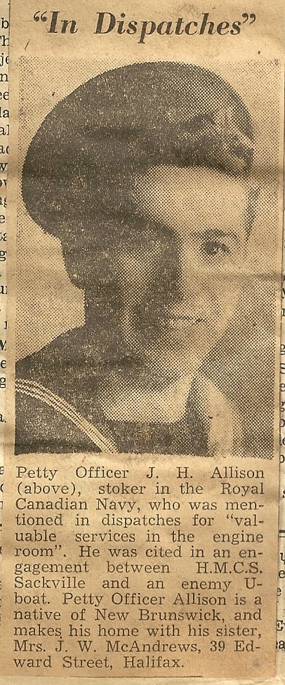 Mentioned in Despatches Citation: ALLISON, James Henry Luman, Acting Stoker Petty Officer, A-2733, Mention in Despatches, RCNR / HMCS Sackville -Awarded as per Canada Gazette of 21 November 1942 and London Gazette of 18 November 1942. "Over a considerable period of time as Leading Stoker and Stoker Petty Officer, he rendered valuable service in the Engine Room. He led and actively assisted in the training of a depth charge reloading party which contributed to the result of the engagement between HMCS Sackville and an enemy U-Boat."